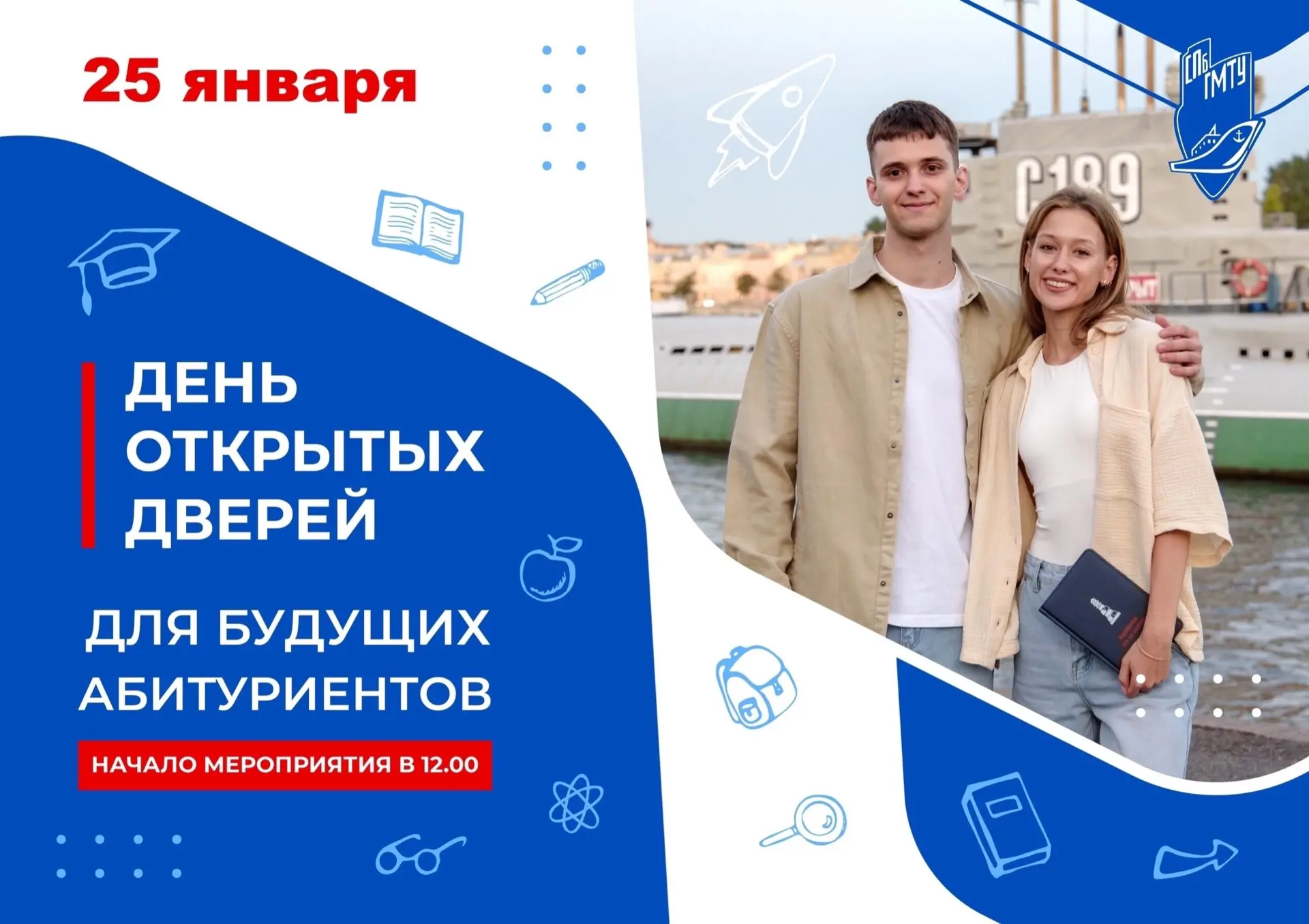 📢25 января приглашаем абитуриентов на день открытых дверей СПбГМТУ по адресу: Ленинский пр., д. 101, строение 4. Начало в 12:00.
