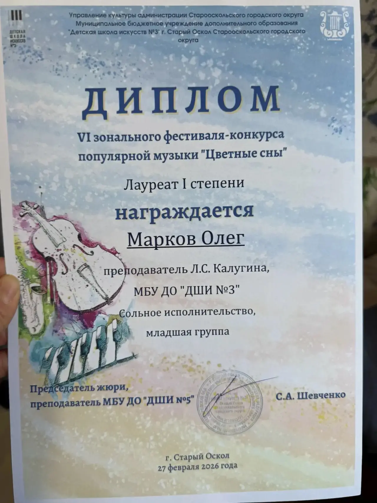 На VI зональном фестивале‑конкурсе популярной музыки «Цветные сны» Олег стал лауреатом I степени!