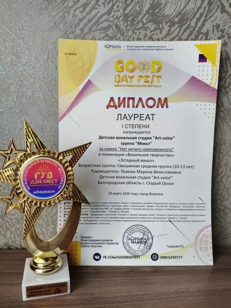 Мария выступала в составе группы «Тоника» вокального коллектива детской вокальной студии Art‑voice — и завоевала высшую награду: Гран‑при! 👏