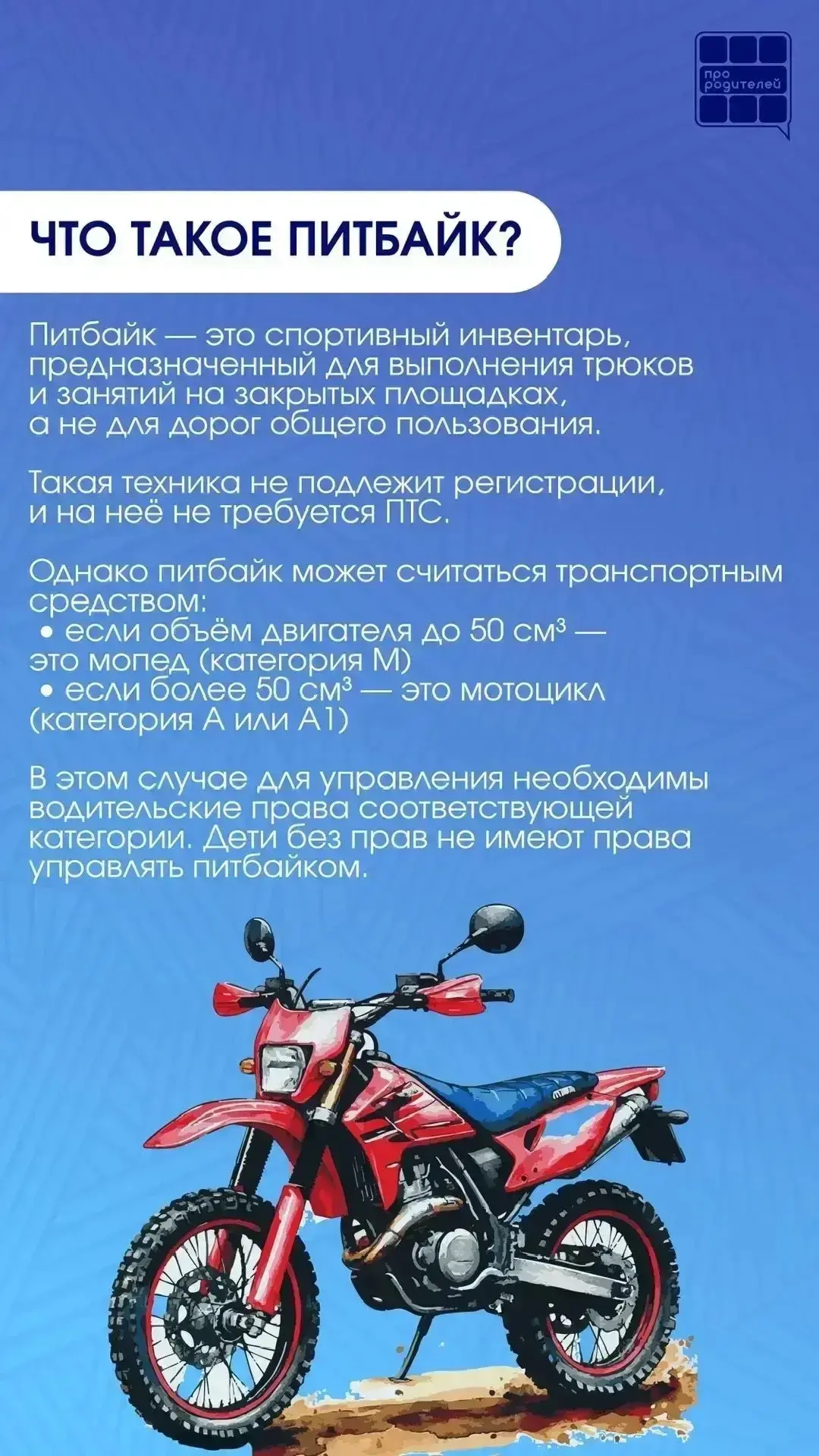Маленький байк — большая ответственность: где заканчивается хобби и начинается закон Лёгкий, быстрый, «как у взрослых» — питбайк всё чаще становится желанным подарком для подростков. Родителям кажется: пусть лучше катается, чем сидит в телефоне. Но здесь важно не перепутать хобби с реальной угрозой. Потому что за этим «безобидным увлечением» могут стоять травмы, серьёзные последствия… и ответственность, о которой многие даже не задумываются. Наш эксперт — Виктория Чаплыгина, начальник кафедры криминалистики и предварительного расследования в ОВД Орловского юридического института МВД России имени В.В. Лукьянова — подробно объясняет: что такое питбайк с точки зрения закона, где на нём можно ездить, и какую ответственность несут родители и подростки. Сохраните этот пост и обязательно поделитесь с другими родителями — возможно, именно эта информация убережёт семью от неприятных последствий.