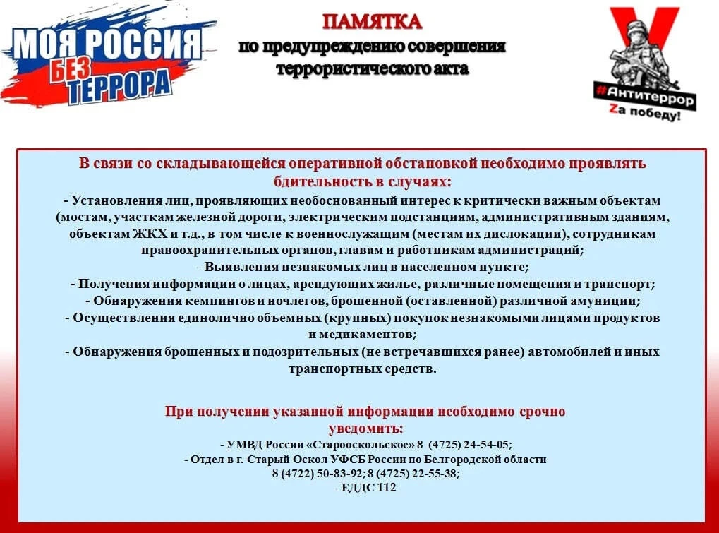 В связи со складывающейся обстановкой необходимо проявлять бдительность в случаях, указанных в памятке.