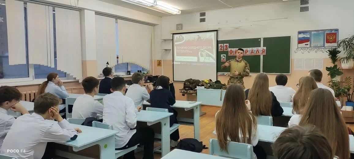 Сегодня у учеников 7 «Г» класса прошло необычное и очень полезное занятие «Герои из соседнего двора». В гости к ребятам пришел выпускник нашей школы — Постников Артём.