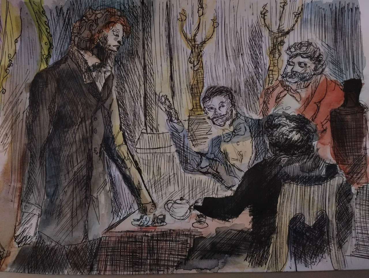 📌 На своем холсте Лев изобразил сцену из спектакля "Отцы и дети", ту самую, что отзывается в душе каждого подростка, независимо от поколения.. Эта сцена актуальна для подростков , потому что затрагивает вечные вопросы: