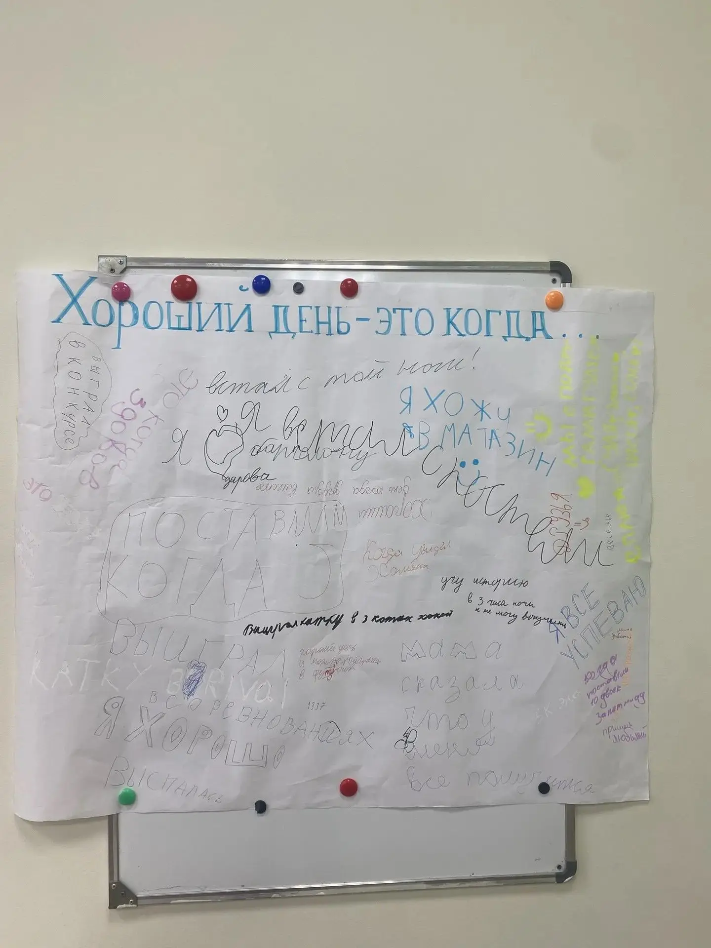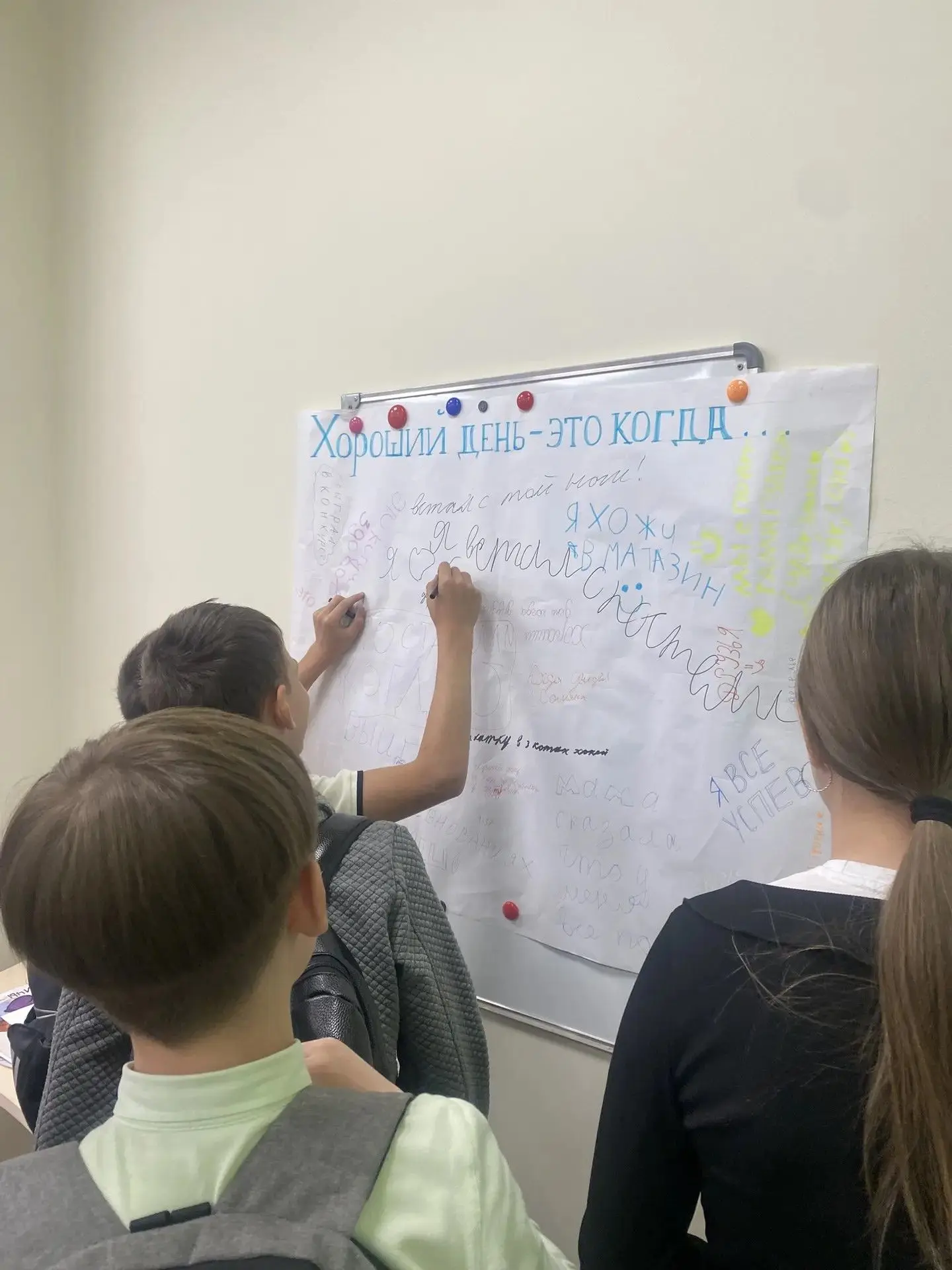 💭 В рамках Недели психологии ученики и педагоги школы приняли участие в акции «Мысли вслух». Ребятам и учителям предложили поразмышлять над фразой «Хороший день — это когда…» и поделиться своими мыслями в рисунках или коротких ответах.