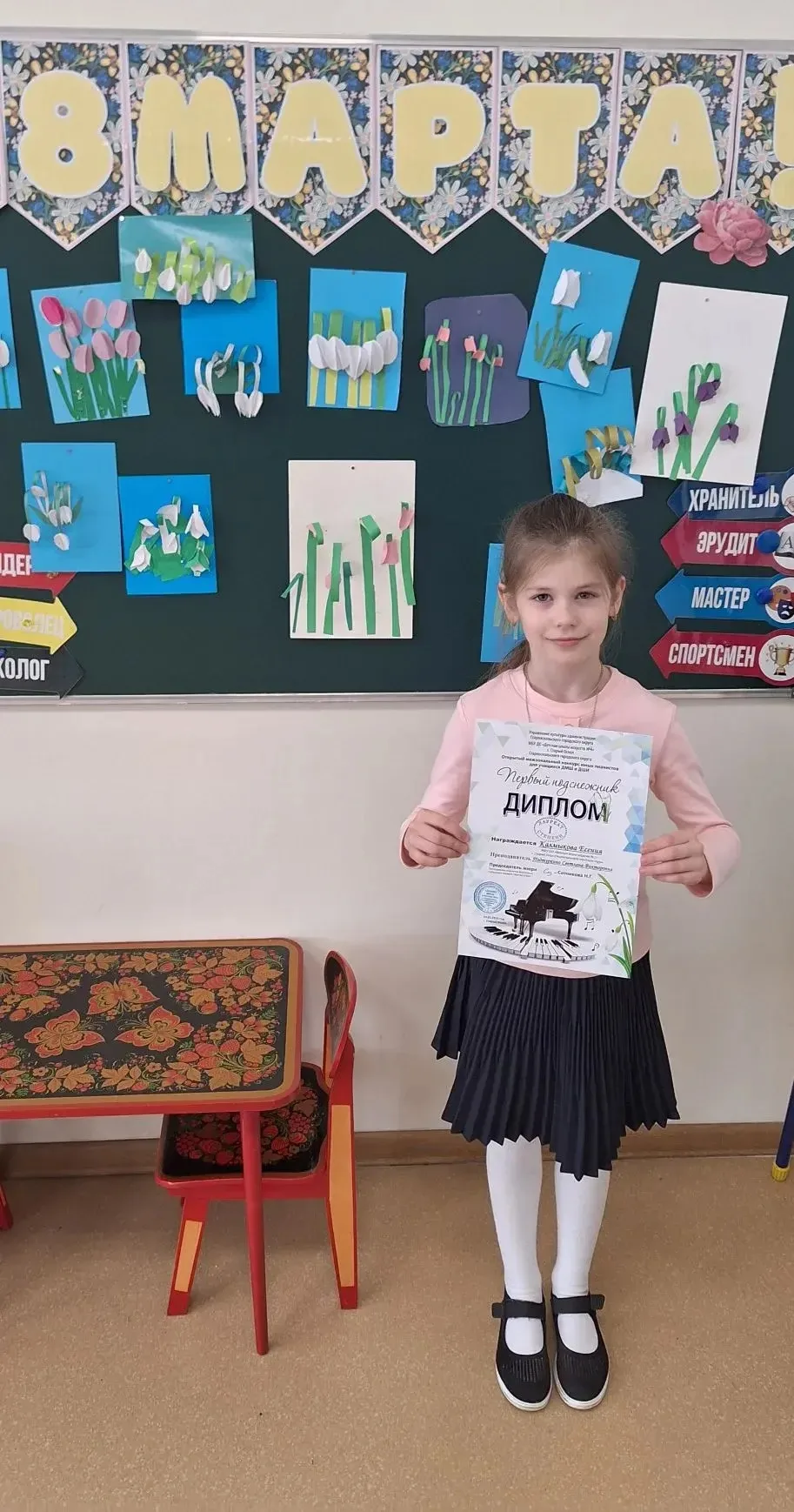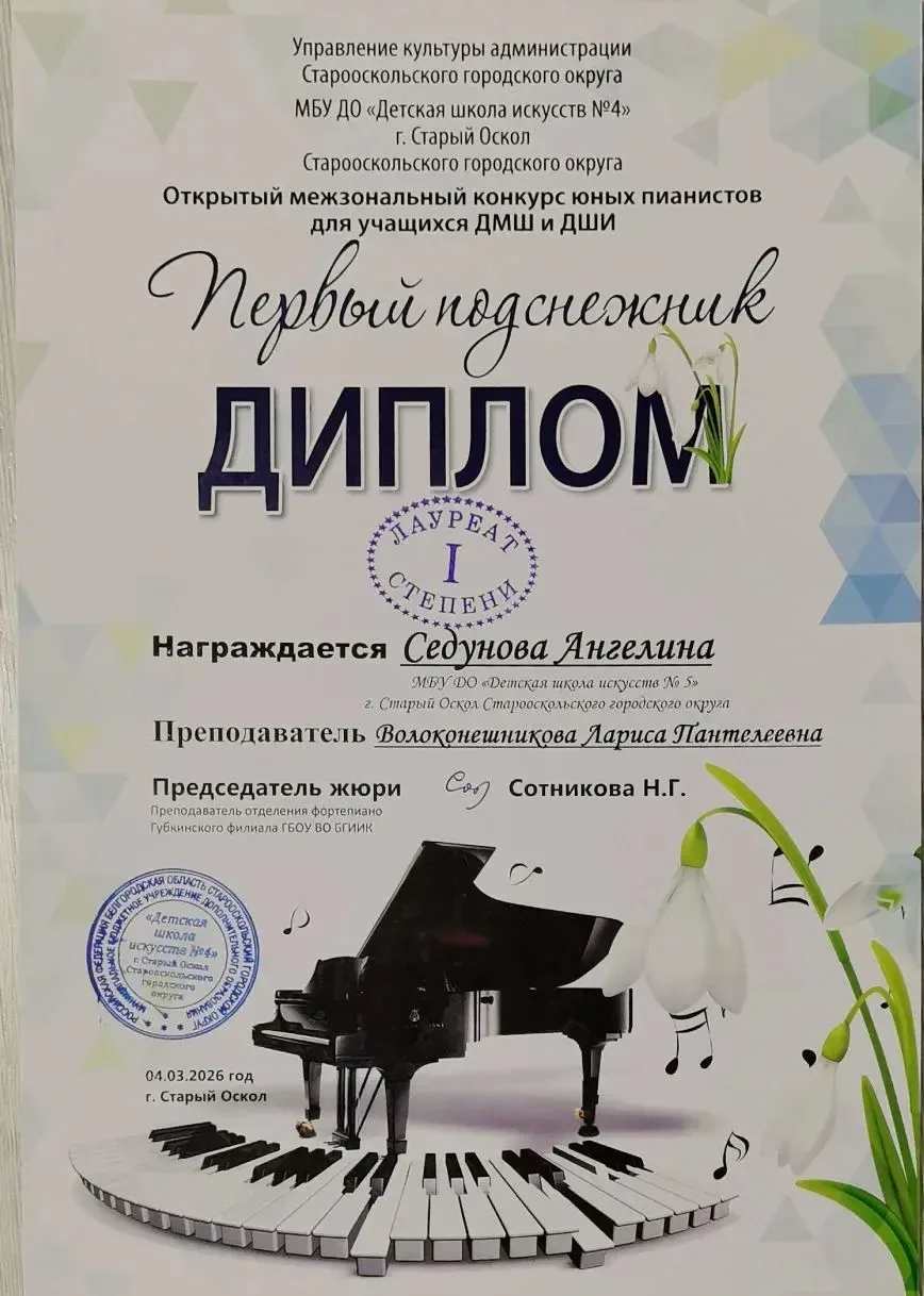 • Ученицы 2 «А» класса Ангелина Седунова, 1 «Д» класса Есения Калмыкова и 2 «Г» класса Мария Копылова стали лауреатами 1 степени межзонального конкурса юных пианистов для учащихся ДМШ и ДШИ «Первый подснежник».
