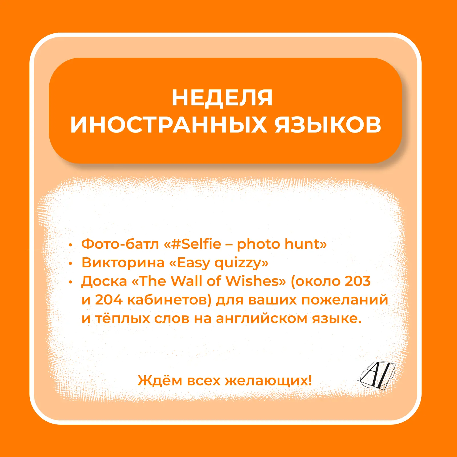 В завершение недели все желающие могут оставить свои впечатления, пожелания и эмоции на The Wall of Wishes в рекреации возле кабинетов 203 и 204. Финальный день впереди — завершаем Неделю иностранных языков ярко!