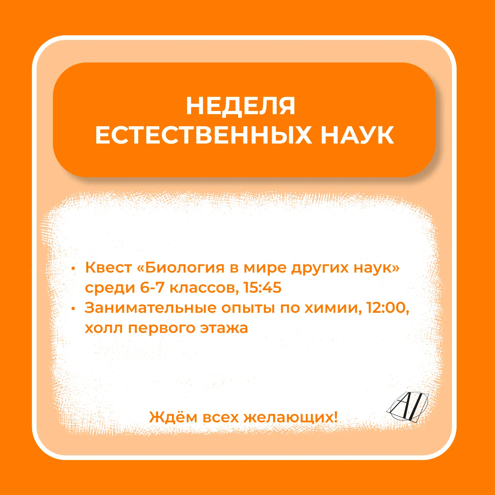 🧬 Для учеников 6-х и 7-х классов пройдет квест «Биология в мире других наук». Начало в 15:45. Это отличная возможность проверить свои знания и увидеть, как биология связана с другими предметами!