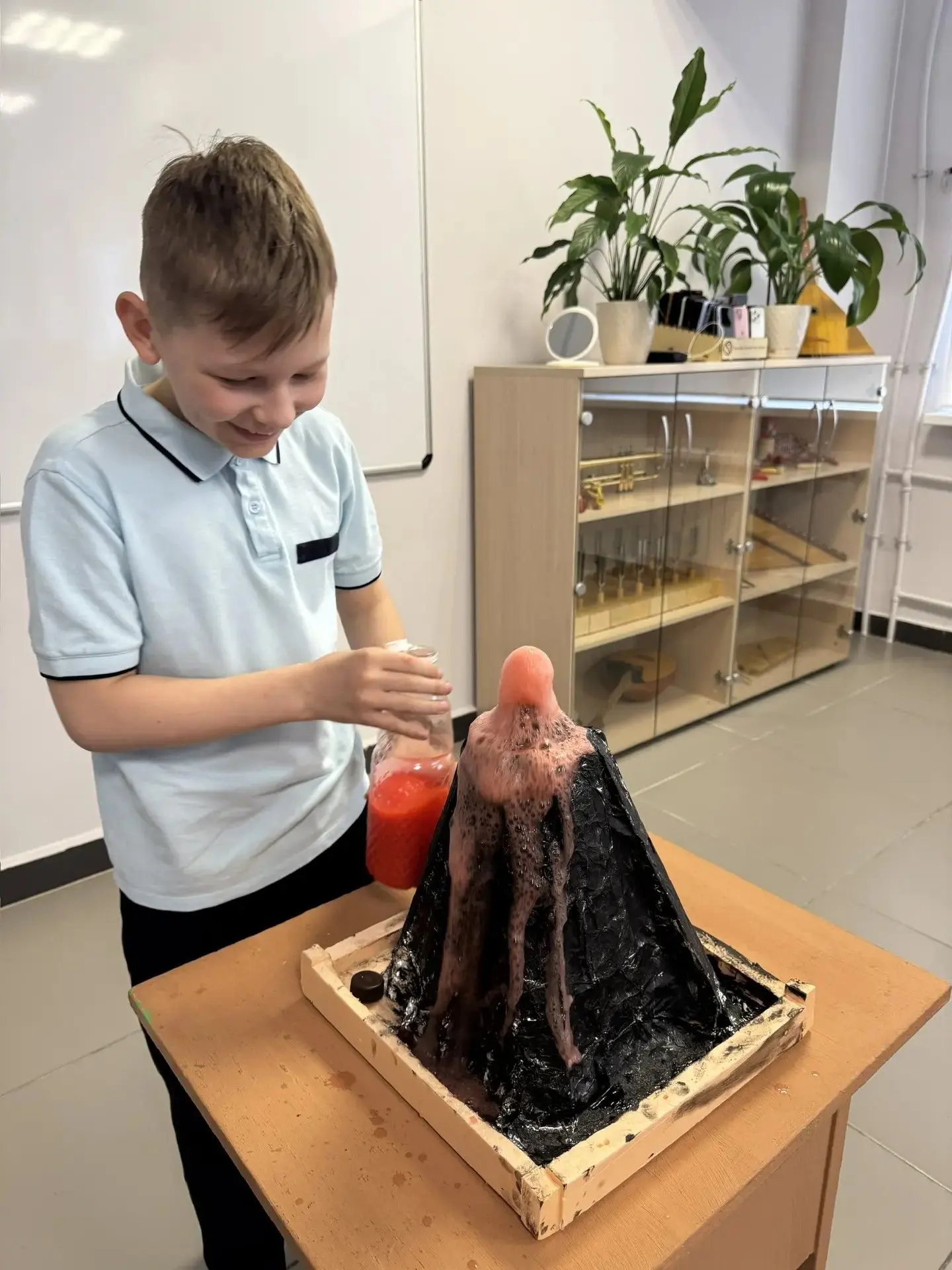 🌋 На уроке географии ученики 5 «В» класса закрепили свои знания о вулканах и подготовили действующие модели, наглядно показав, как происходит извержение. Урок получился очень зрелищным и точно запомнился ребятам.
