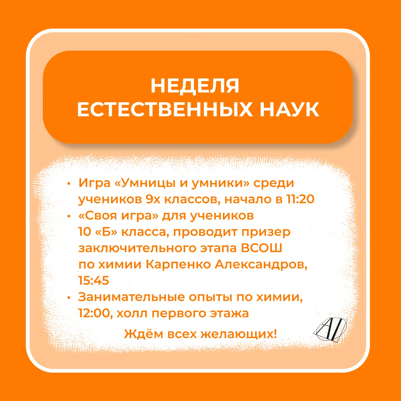 🎓 Для учеников 9-х классов пройдет игра «Умницы и умники». Начало — в 11:20. А для 10 «Б» класса состоится «Своя игра», которую проведет призер заключительного этапа ВсОШ по химии Карпенко Александр.
