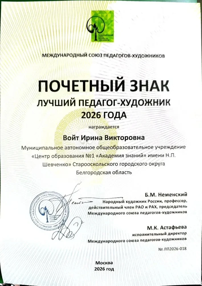 • Учитель изобразительного искусства Ирина Викторовна Войт принимает участие в 11 Международной выставке педагогов-художников «Образ моей страны» и получила почетный знак «Лучший педагог-художник года».