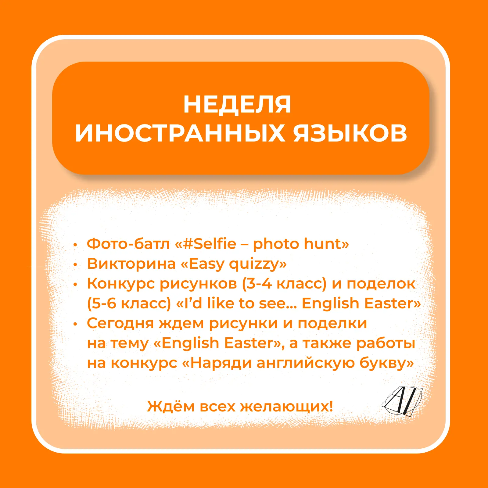 🎨 Уже сегодня, 6 апреля, ждем рисунки и поделки на тему «English Easter», а также работы на конкурс «Наряди английскую букву». В течение всей недели можно искать достопримечательности в школе, делать селфи для фото-батла и проходить викторину по QR-кодам возле кабинетов английского языка.