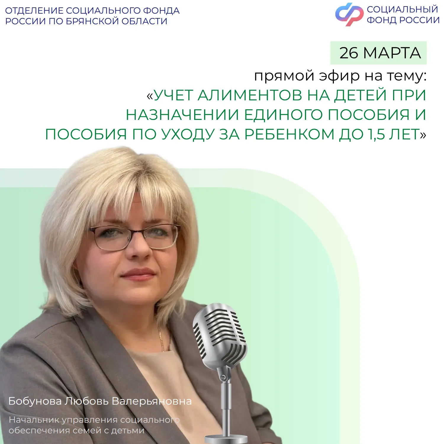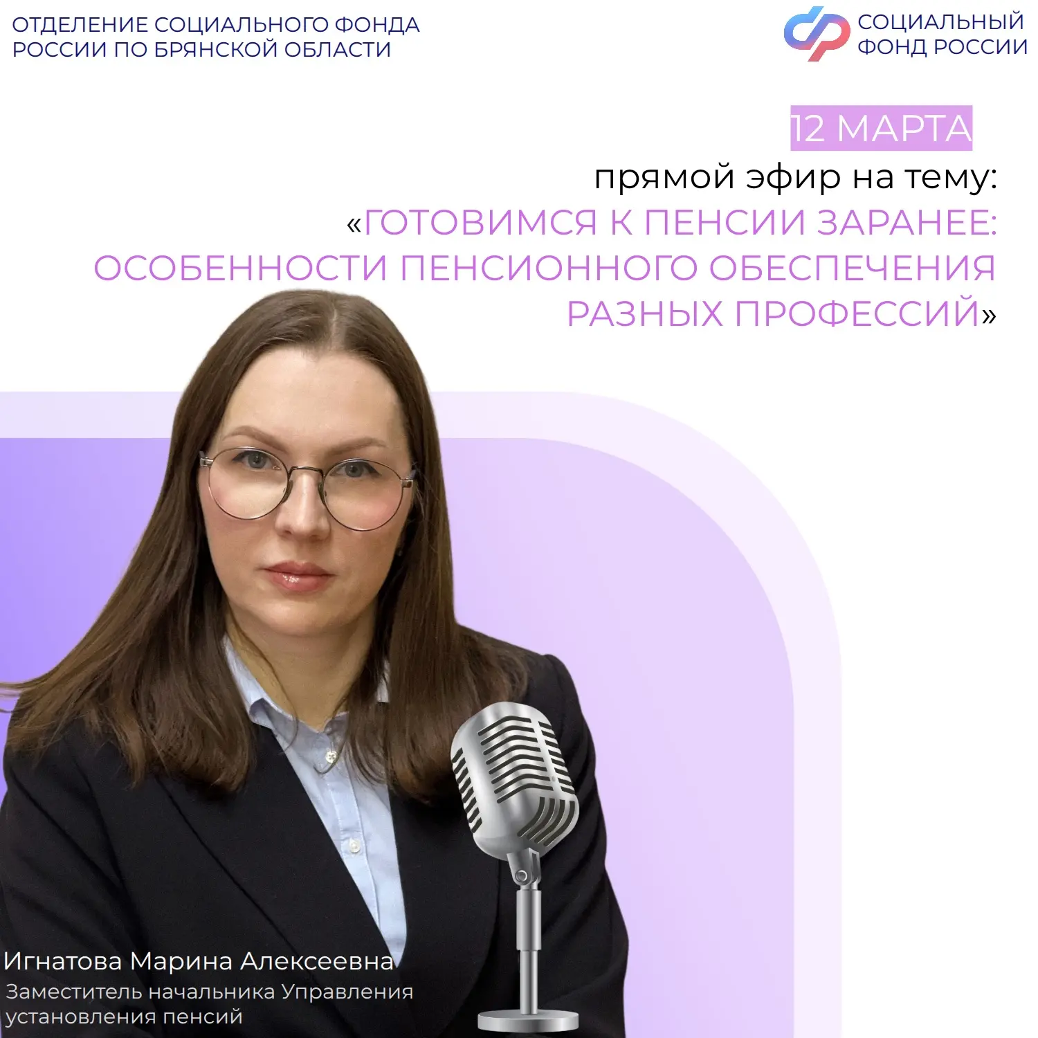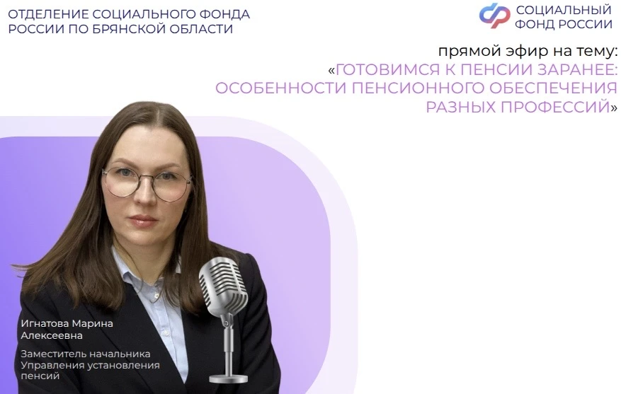 🎙️12 марта в 11:00 в группе Отделения СФР по Брянской области ВКонтакте состоится прямой эфир с заместителем начальника Управления установления пенсий Игнатовой Мариной Алексеевной, которая ответит на вопросы об особенностях пенсионного обеспечения разных профессий.