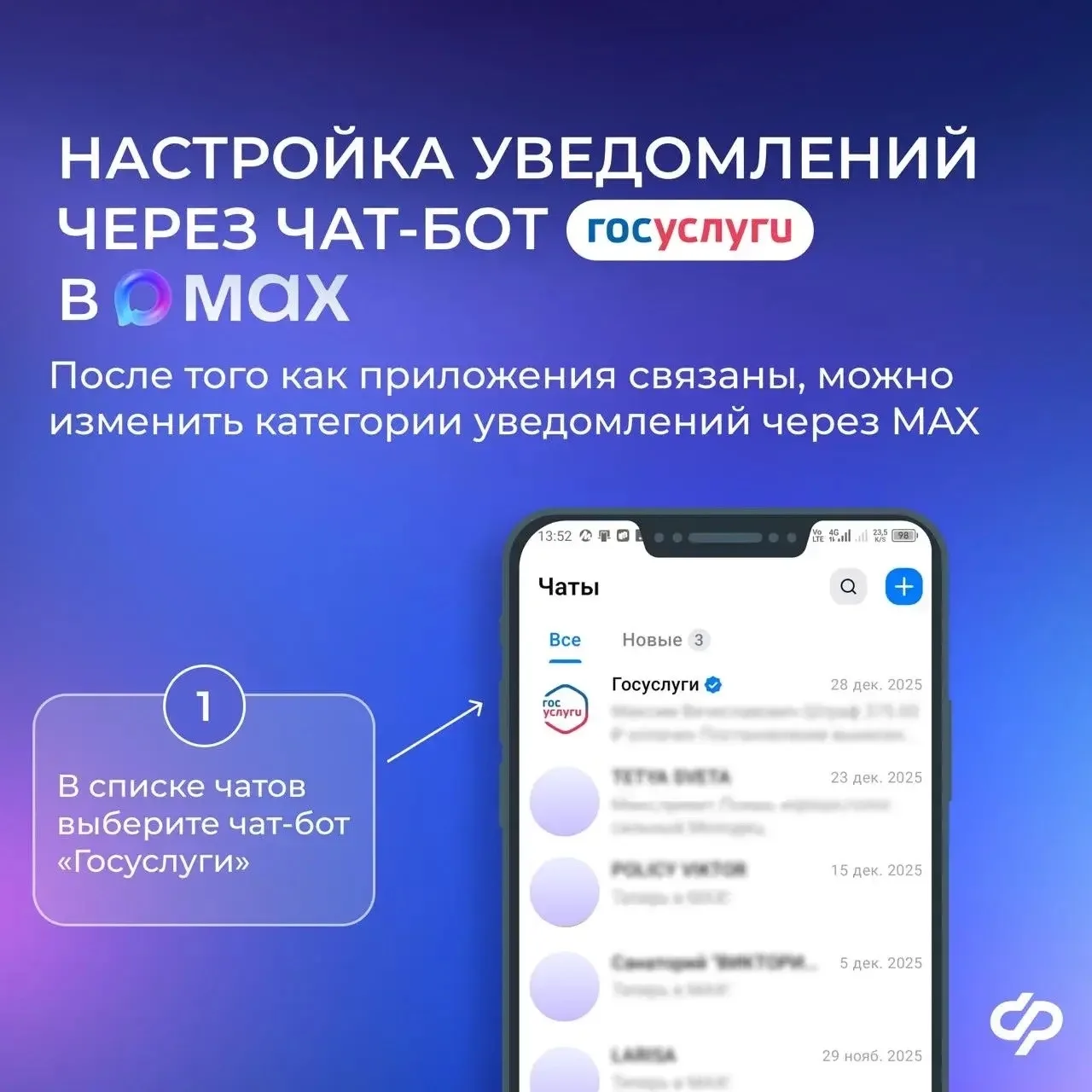 ✔ Система подтвердит совпадение номеров, и чат‑бот начнет присылать сообщения. Уведомления, которые вы хотите получать от «Госуслуг», можно настроить в личном кабинете портала, а также в MAX. Показываем в карточках, как это сделать.