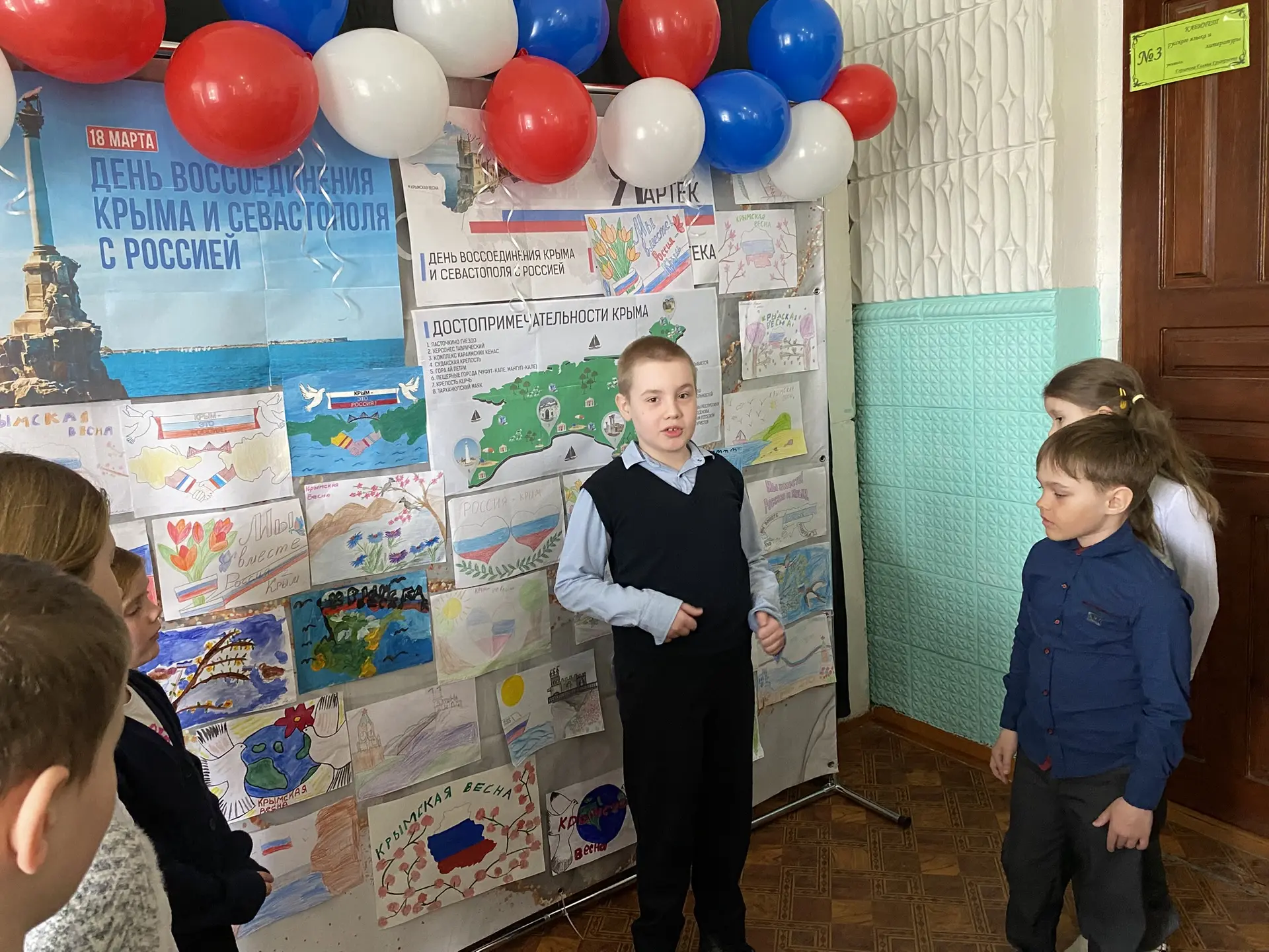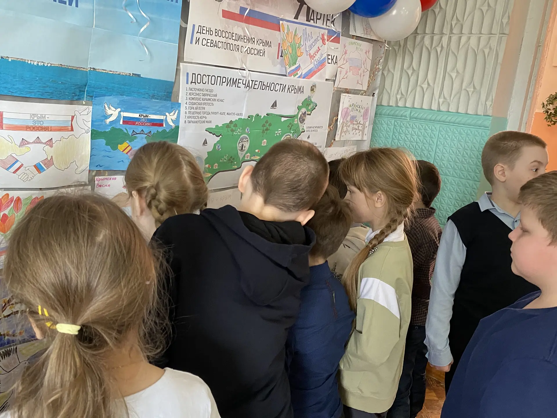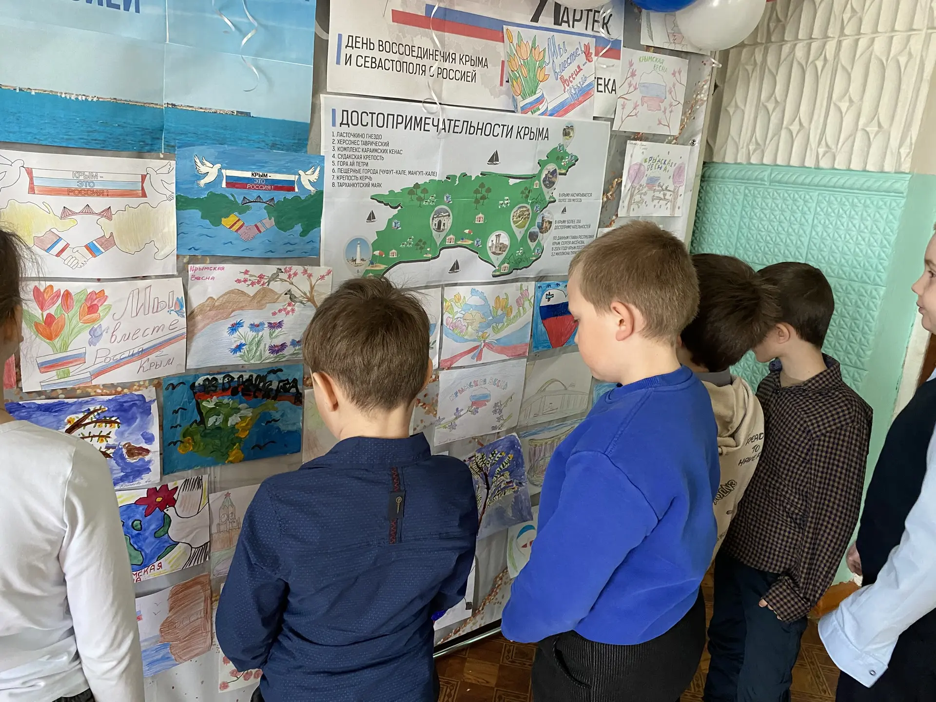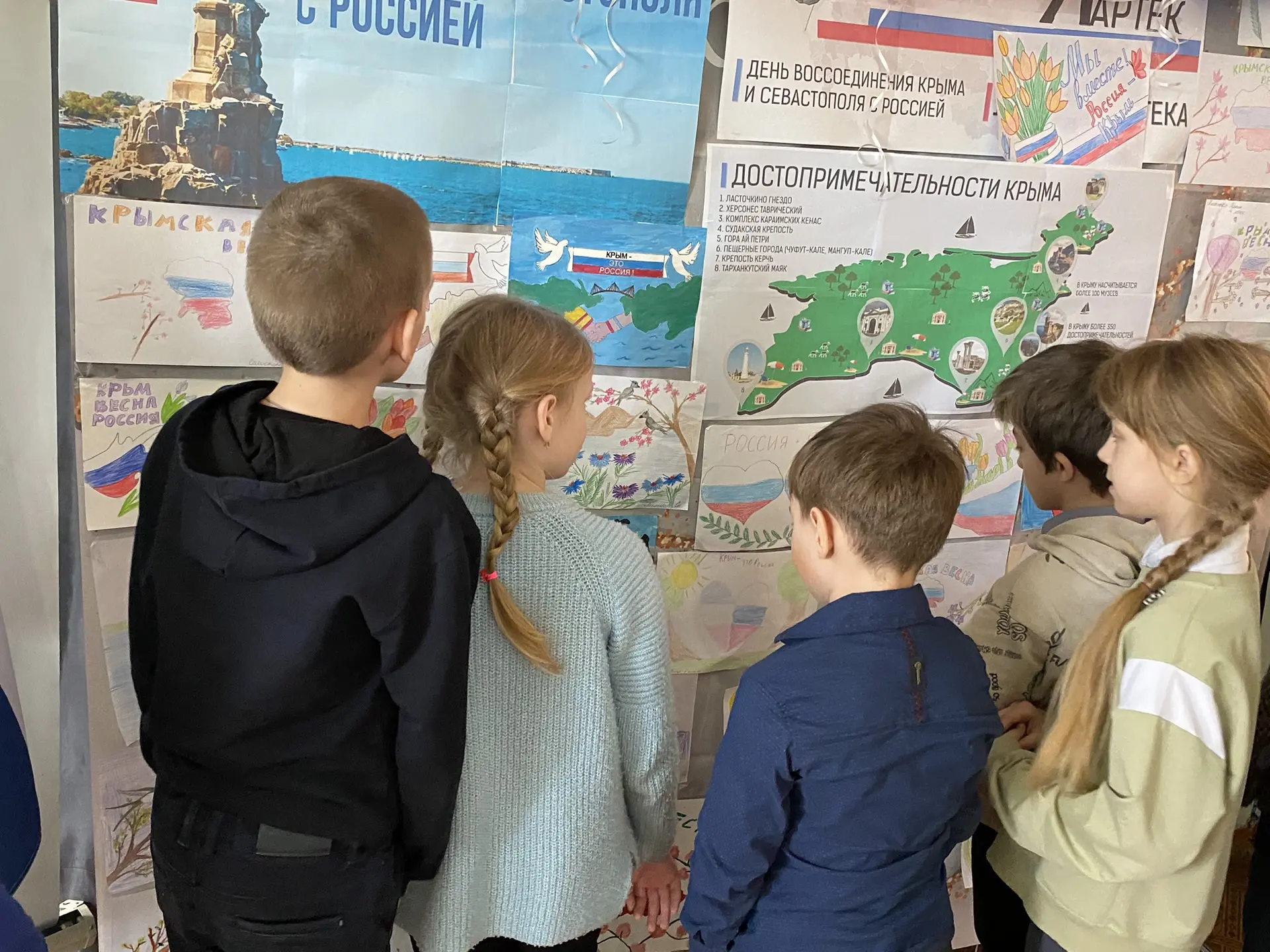 В день воссоединения Крыма с Россией советником директора по воспитанию Куликовой М. В. в нашей школе была организована выставка детских рисунков.