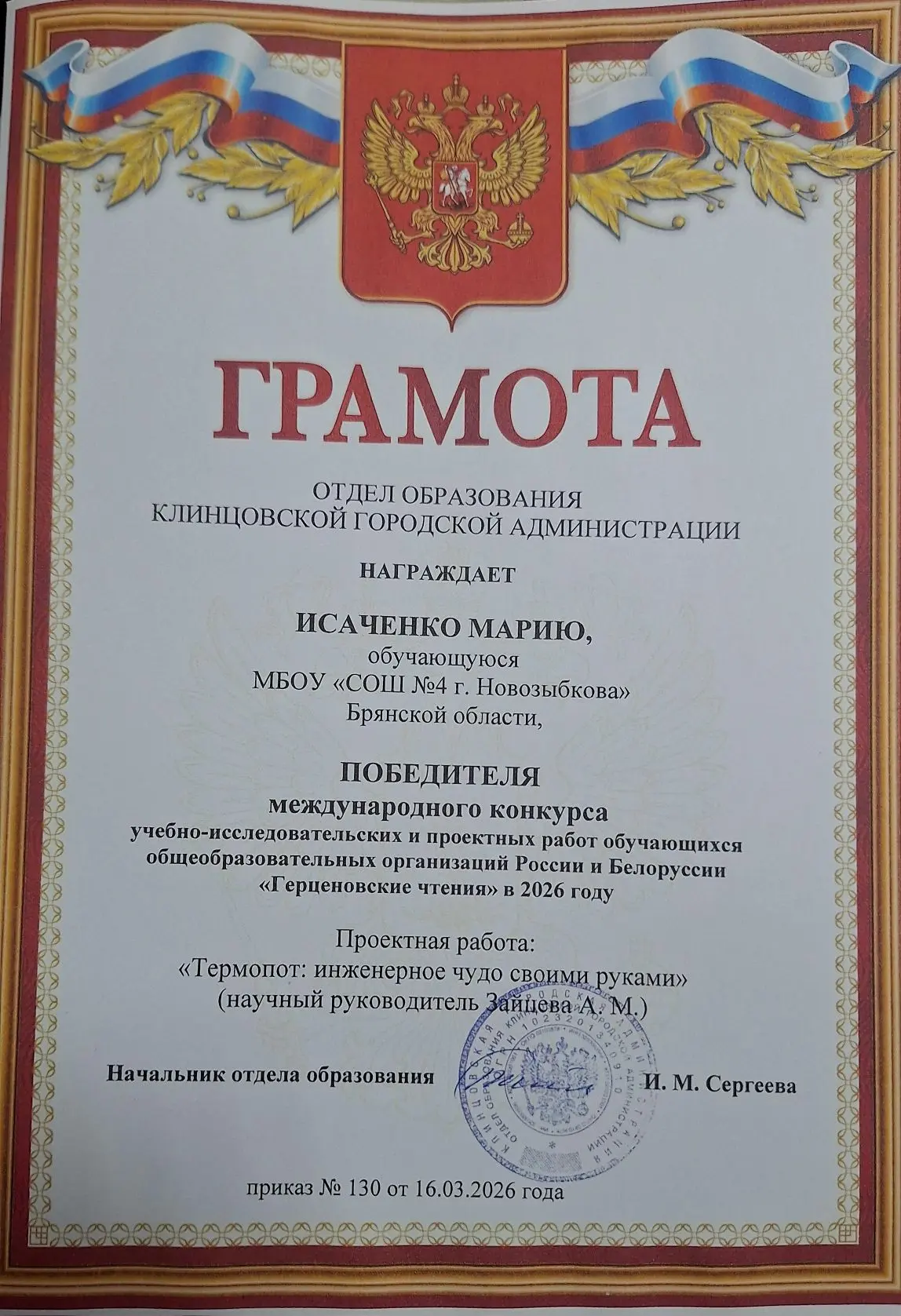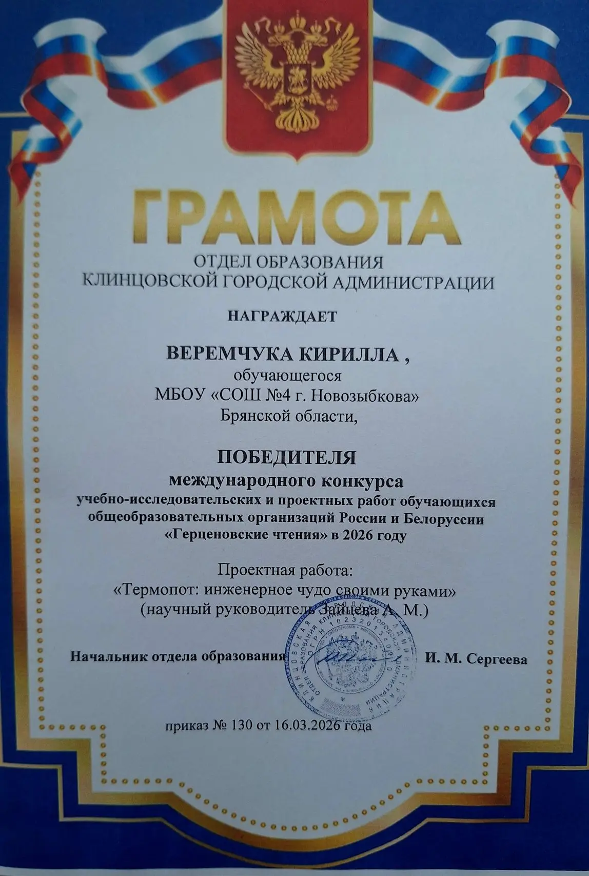 ⚡Поздравляем Исаченко Марию и Веремчука Кирилла с ПОБЕДОЙ В МЕЖДУНАРОДНОМ конкурсе учебно-исследовательских и проектных работ обучающихся общеобразовательных организаций России и Белоруссии "Герценовские чтения"!!!