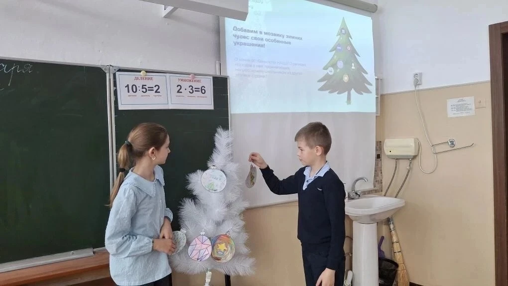 В завершении внеурочного занятия ребята добавили в мозаику зимних чудес свои особенные украшения и расписали ёлочные шары, украсив ёлку своего класса.