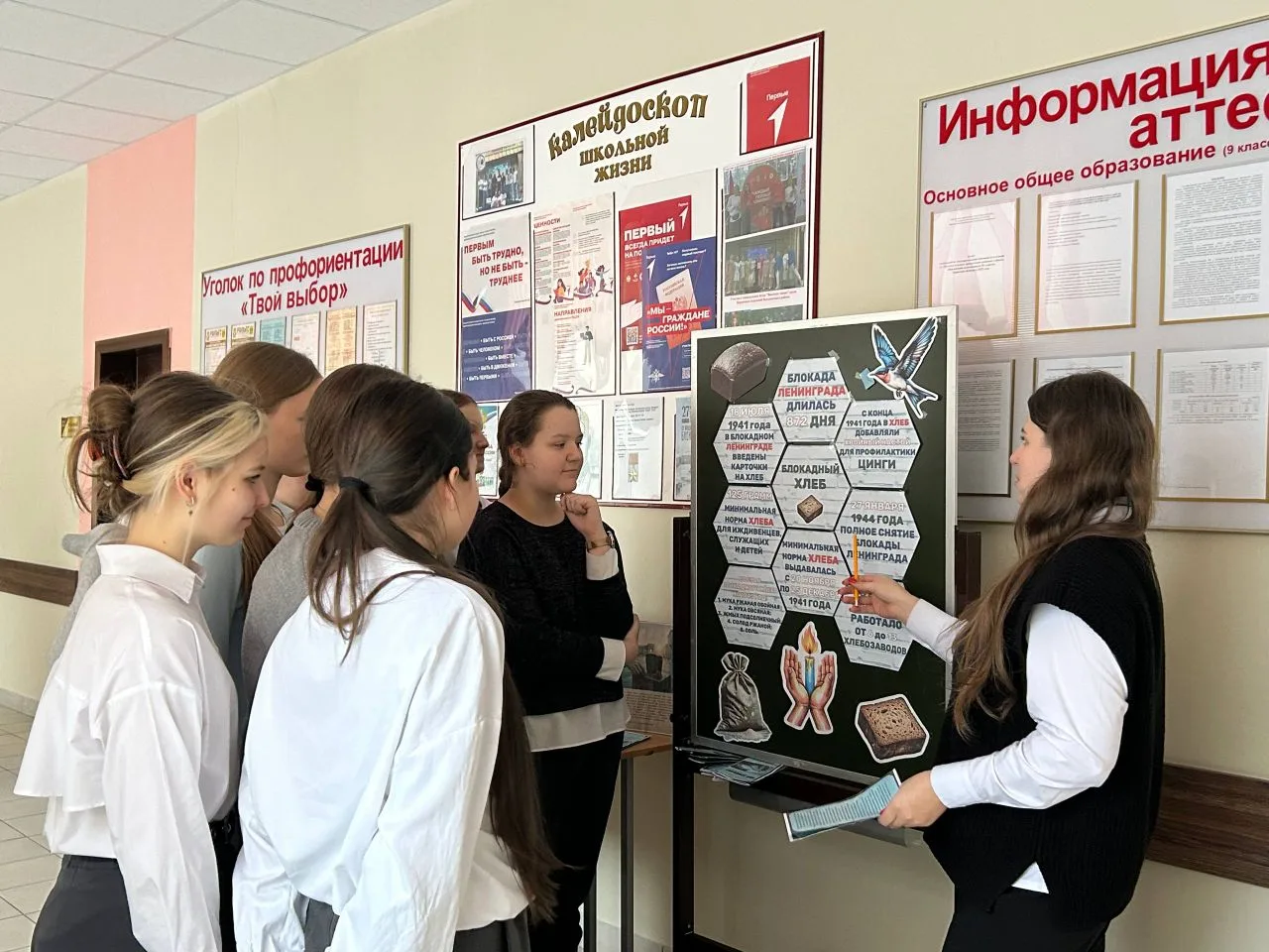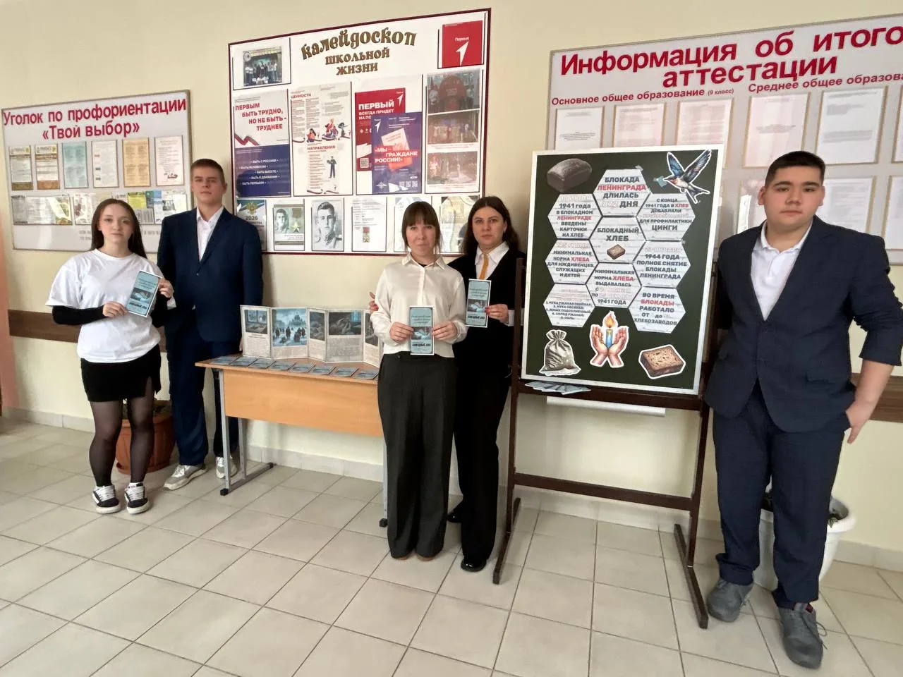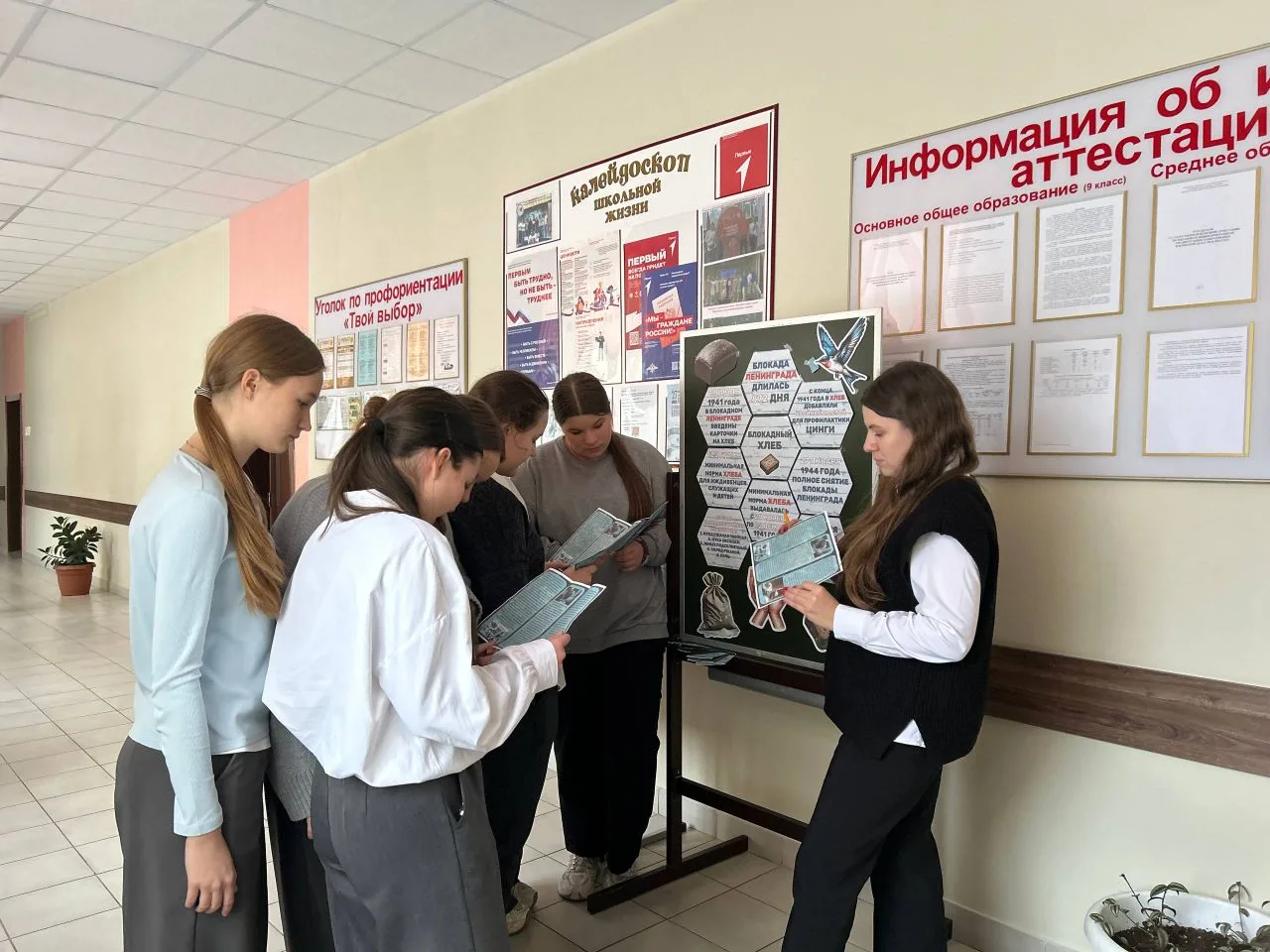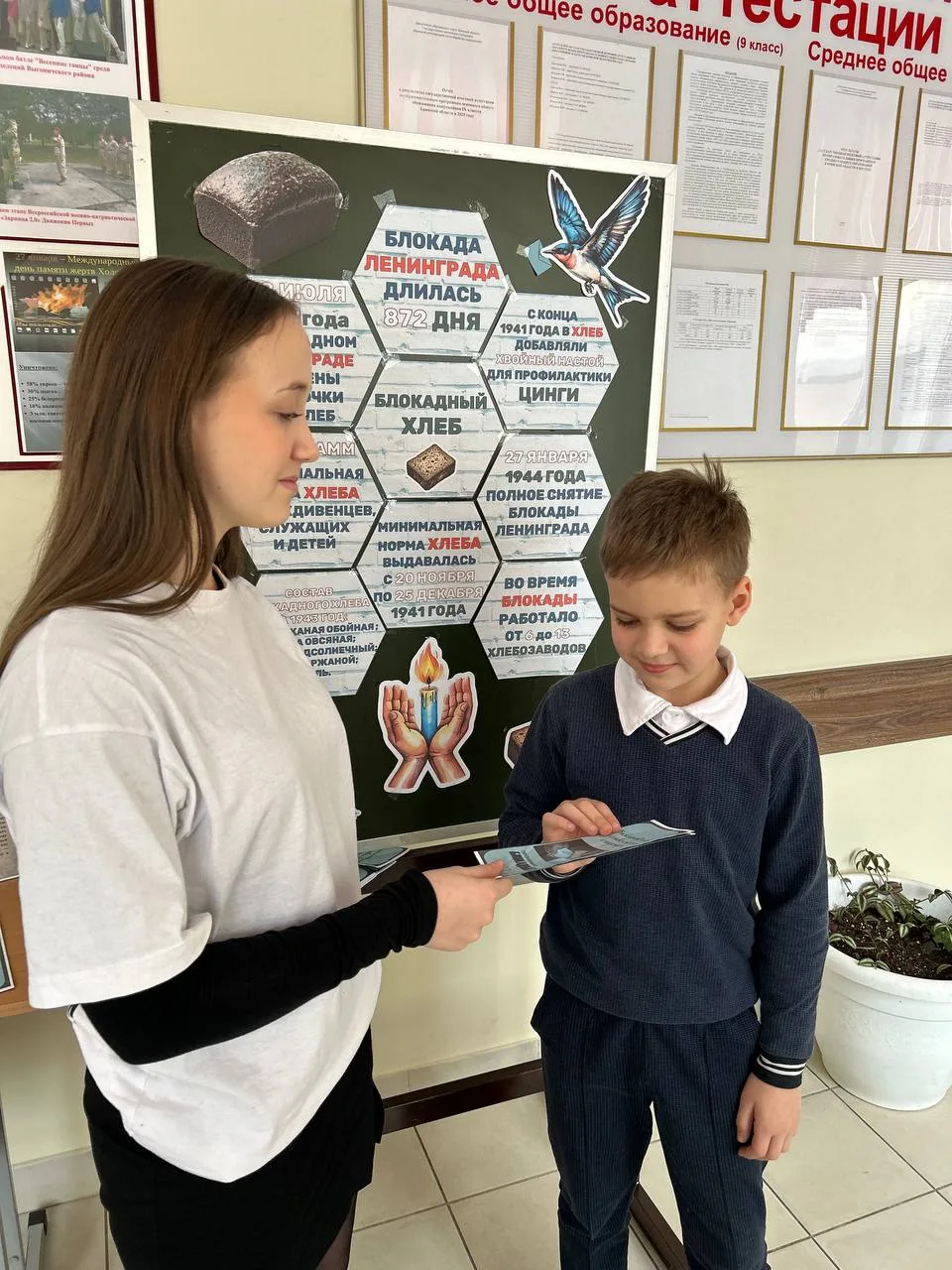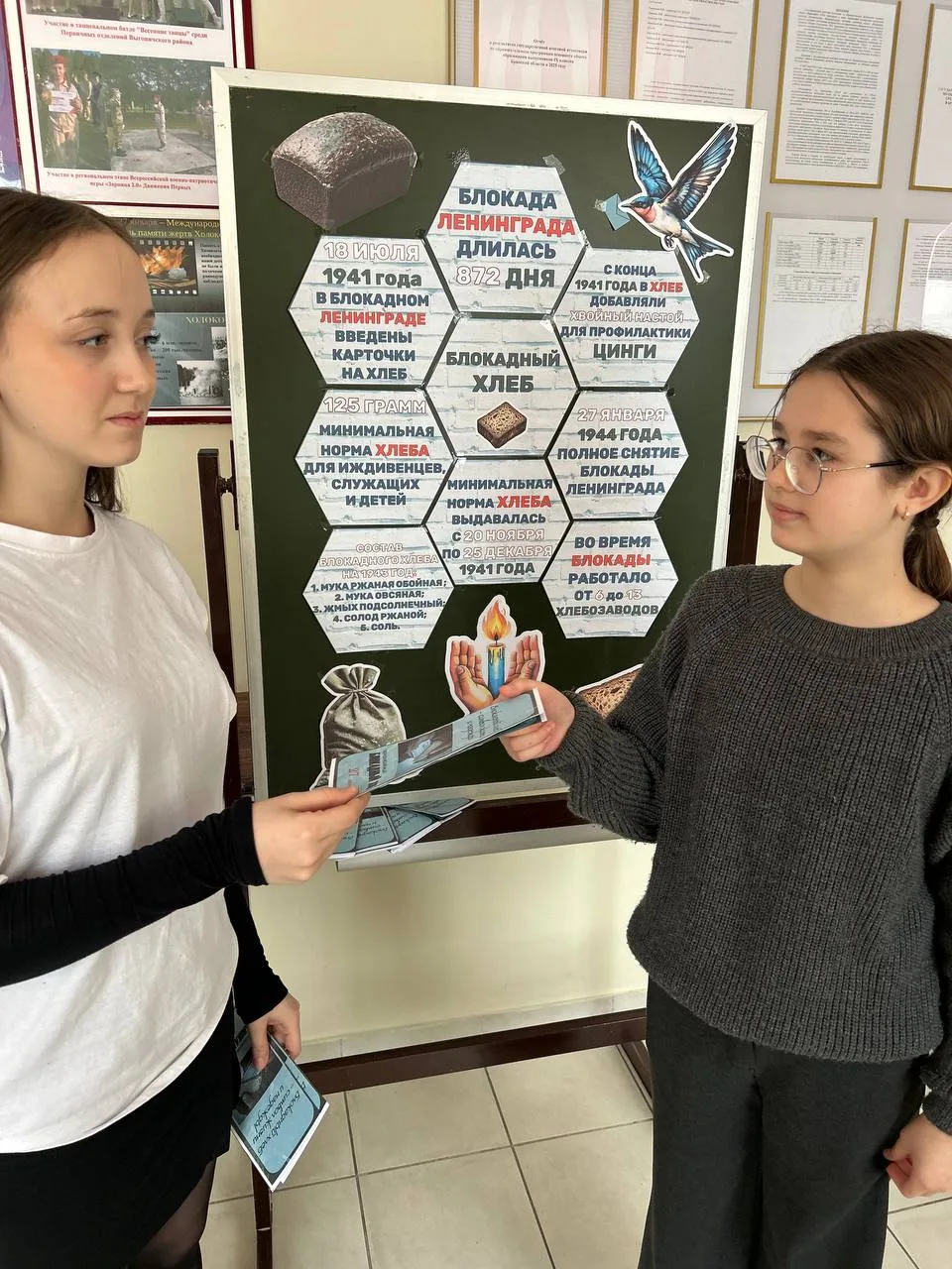 Кроме того, ребята изготовили папку-передвижку, содержащую информацию о тех страшных для Ленинграда днях блокады. У информационного стенда активисты рассказывали обучающимся о событиях тех лет, о людях, которые пережили блокаду и о том, как они боролись за выживание.
