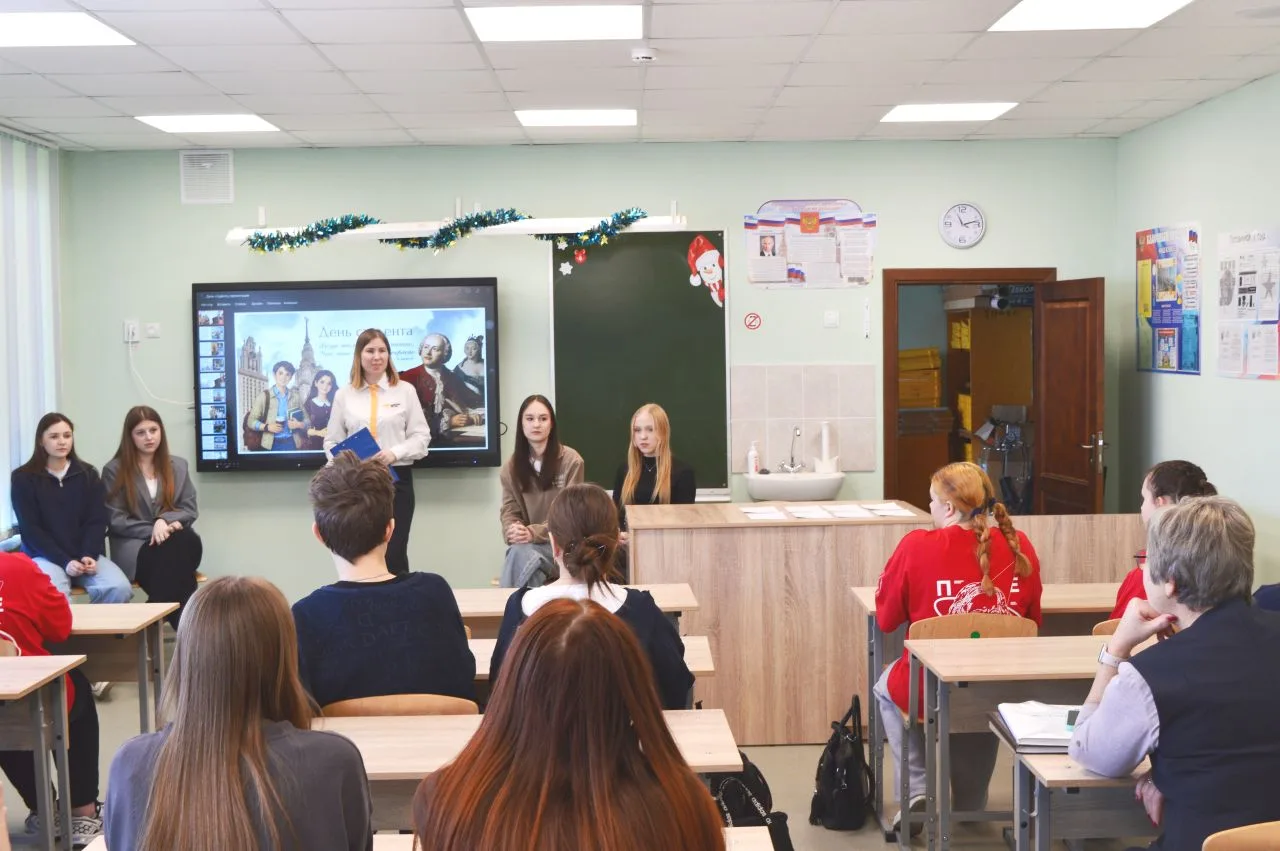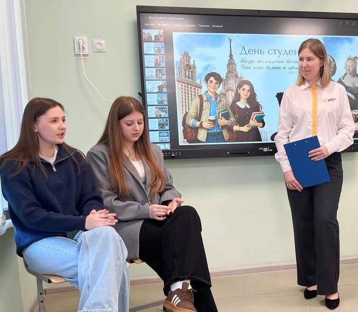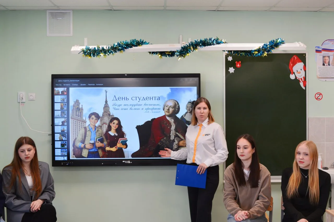 В преддверии 🎓ДНЯ СТУДЕНТА🎓советником директора по воспитанию была организована встреча 9 и 11 класса с выпускниками нашей школы: Авраменко Дианой, Кондратовой Екатериной, Будасовой Анной, Смолянова Дианой, которые являются первокурсницами ФГАОУ ВО РНИМУ им. Н.И. Пирогова, Тверского медицинского государственного университета и Саратовской государственной юридической академии. Студентки рассказали школьникам об учебном процессе в высшем учебном заведении и о студенческой жизни. Евгения Евгеньевна рассказала об истории возникновения этого праздника и предложила учащимся 9 и 11 класса побыть в роли студентов, сдать экзамен. Ребята с энтузиазмом отвечали на интересные вопросы экзаменационных билетов.