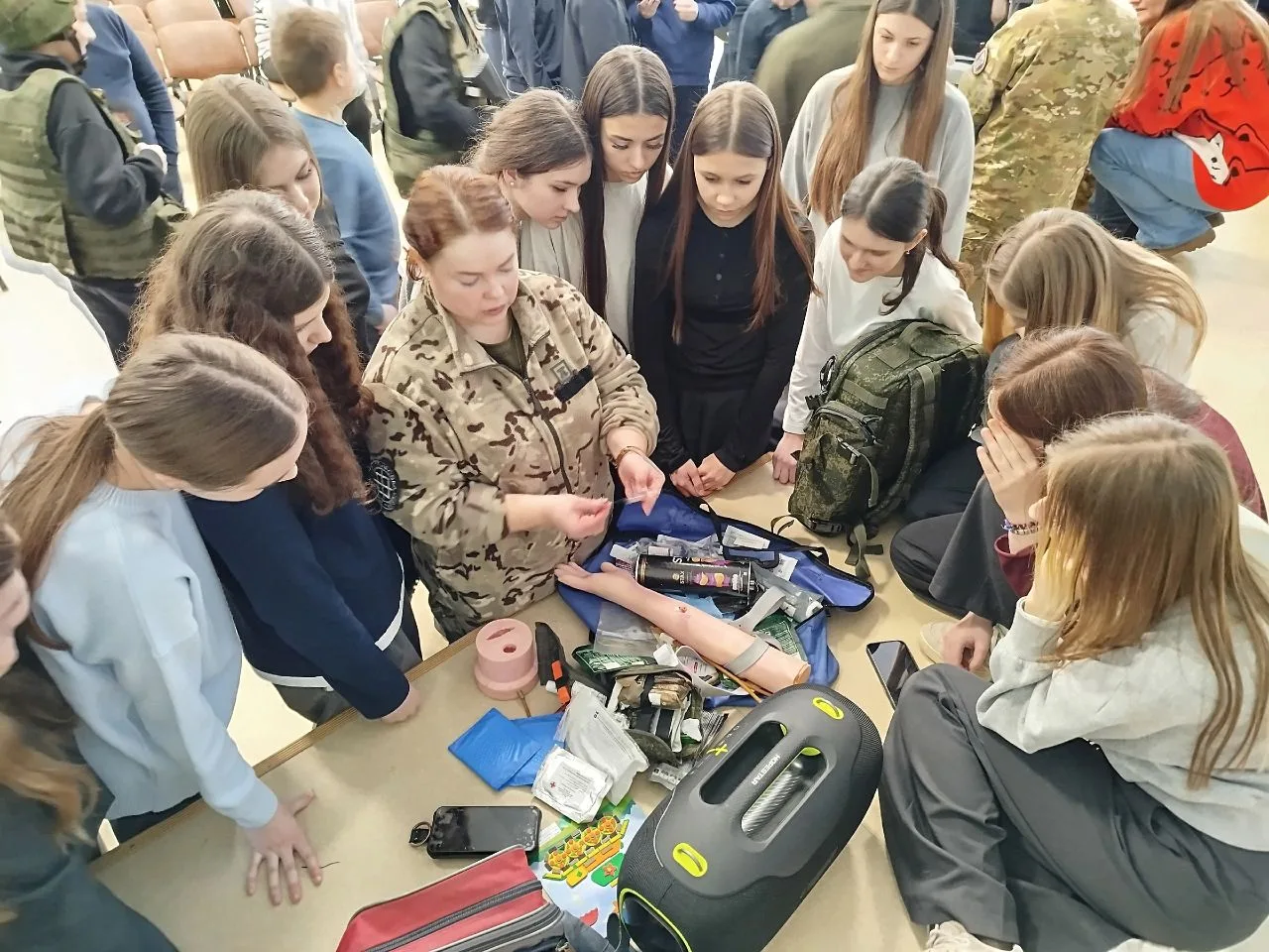 Военнослужащих рассказали много важной информации о правилах поведения на нашей приграничной территории, о том, как нужно себя вести при «встрече» с дронами, о том, что следует безукоснительно соблюдать главный закон безопасности: «Не ты положил – не бери» – ни айфоны, ни деньги, ни игрушки. Бойцы рассказали о том, почему они выбрали службу в отряде. А военный медик «БАРСов» рассказала школьникам о том, что каждый боец должен уметь оказать себе и товарищу первую помощь, продемонстрировала ребятам содержимое походной аптечки, специального медрюкзака и даже научила некоторым навыкам оказания ПМП.
