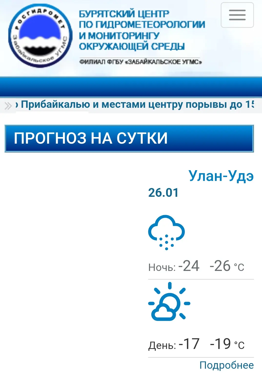 На сайте Бурятского центра по гидрометеорологии и мониторингу окружающей среды — филиала ФГБУ «Забайкальское УГМС» (официальный сайт: www.burpogoda.ru/) разместили прогноз погоды на 26.01.2026.‼
