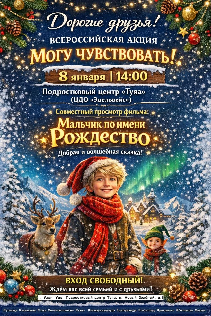 🎆8 января в 14:00 в подростковом центре «Туяа» центра дополнительного образования «Эдельвейс» детско-подростковая аудитория соберётся для совместного просмотра потрясающего полнометражного фильма «Мальчик по имени Рождество» — это добрая, мудрая и волшебная история, которая идеально подходит для зимних каникул. Это путешествие в мир, где рождаются самые чудесные сказки.