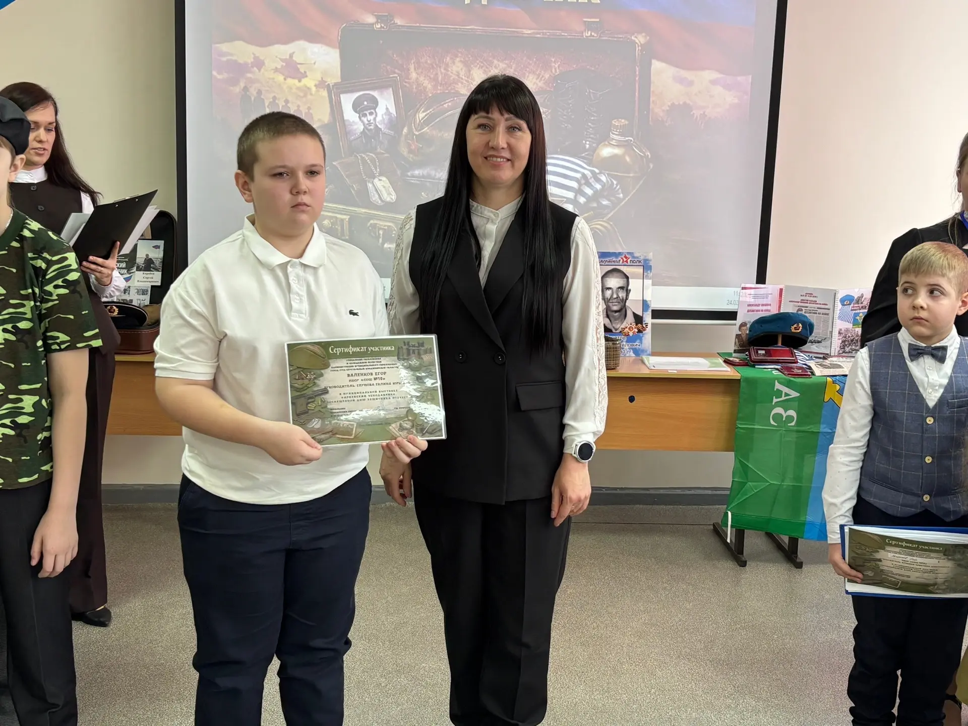 Нашу школу достойно представил ученик 7Б класса Егор Валенков (классный руководитель: Галина Юрьевна), вместе с мамой и ребятами из нашей школы. Егор рассказал о своем родственнике, участнике специальной военной операции.