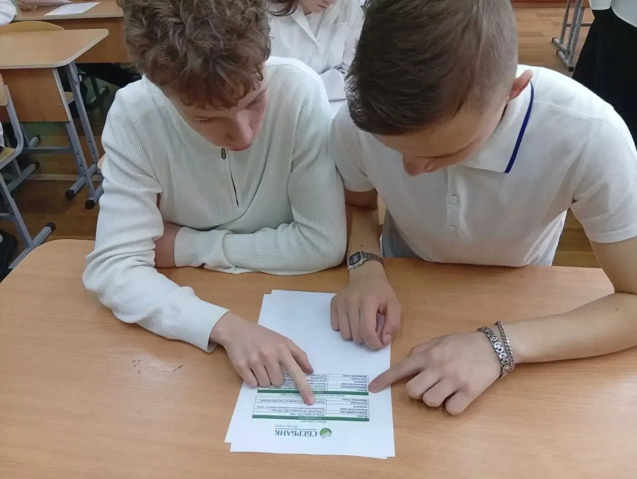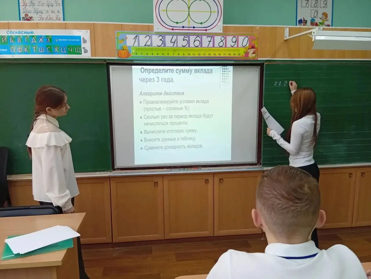 Затем класс перешёл к практической работе. Ученики решали задачу: рассчитать итоговую сумму на вкладе через три года при разных условиях.