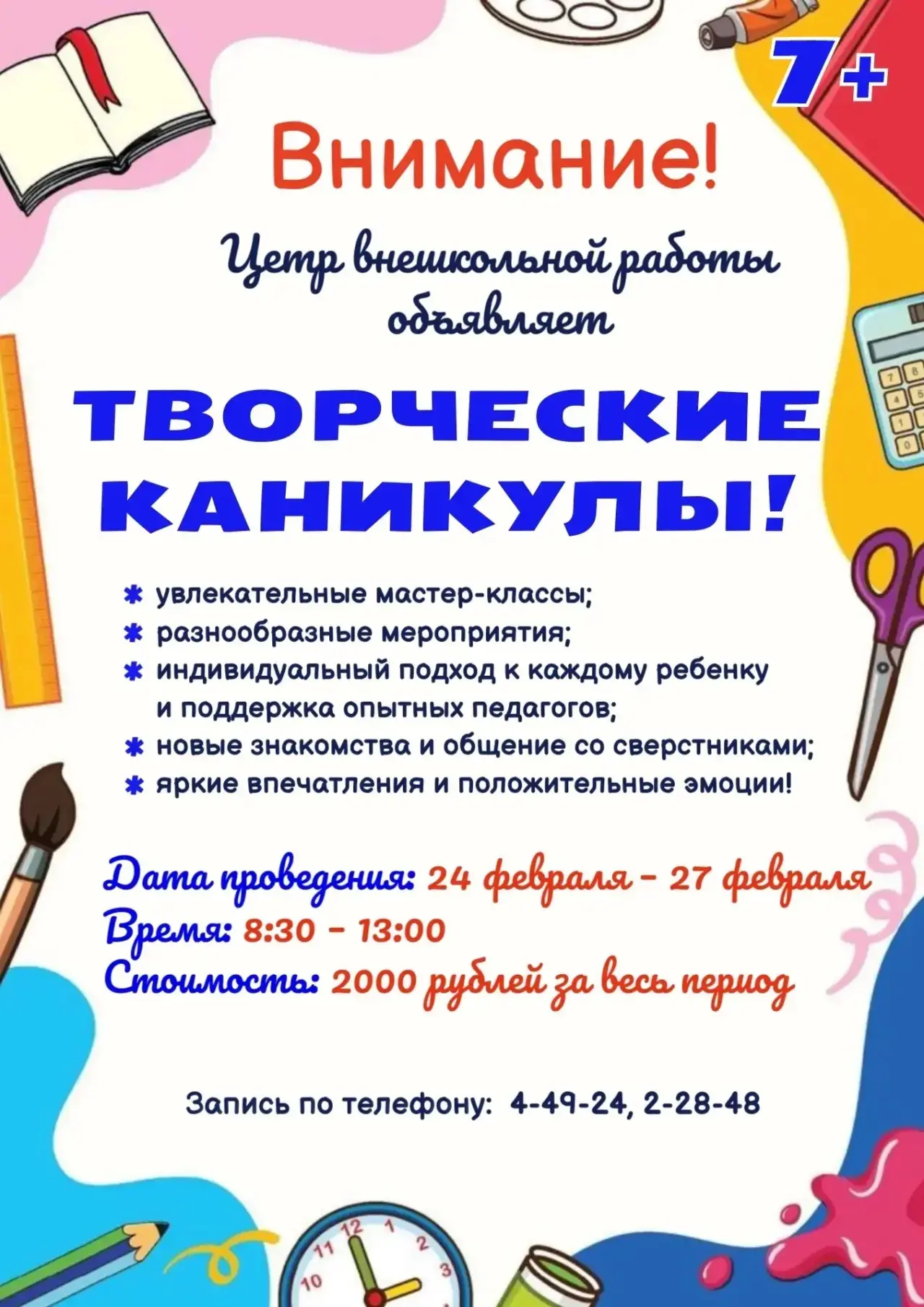 🤗 Рады сообщить вам о проведении творческих каникул в Центре внешкольной работы с 24 по 27 февраля.