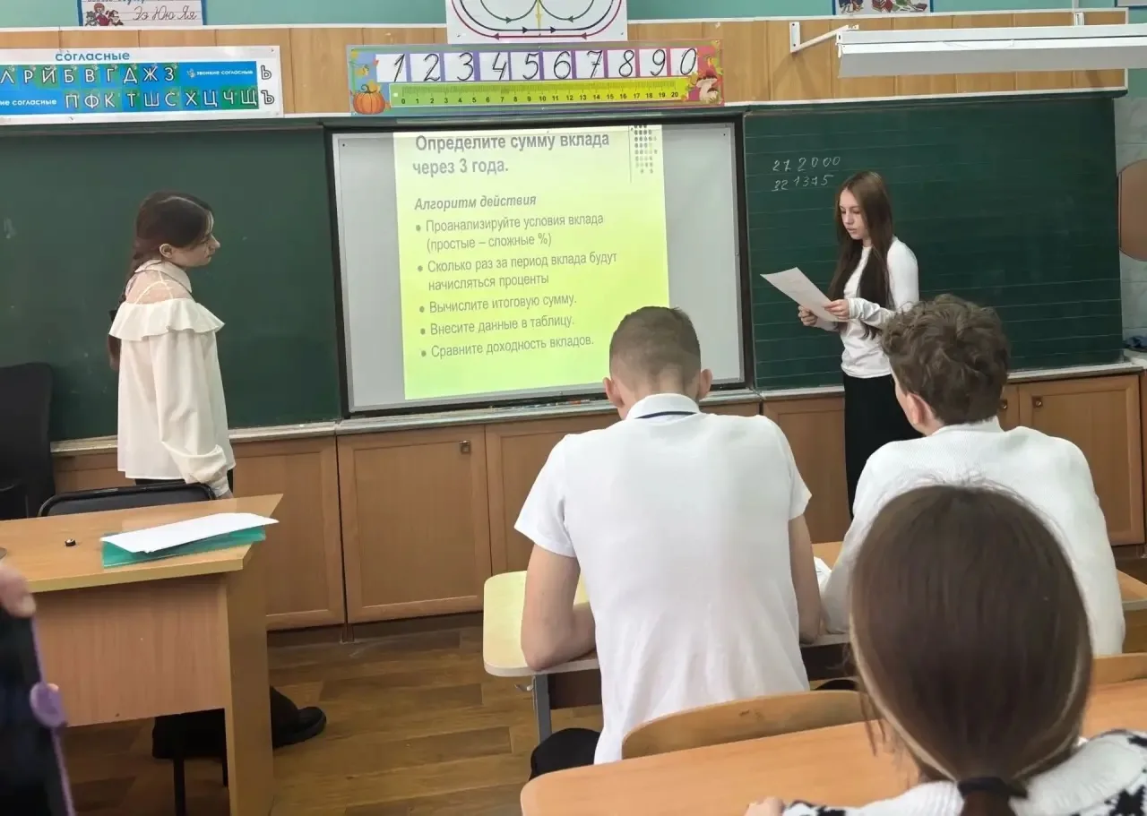 Сегодня ученица 9 го класса Степанова Екатерина провела для своих одноклассников необычный урок алгебры. Вместо привычных задач из учебника ребята разбирались, как работают простые и сложные проценты и как они связаны с реальными банковскими вкладами.