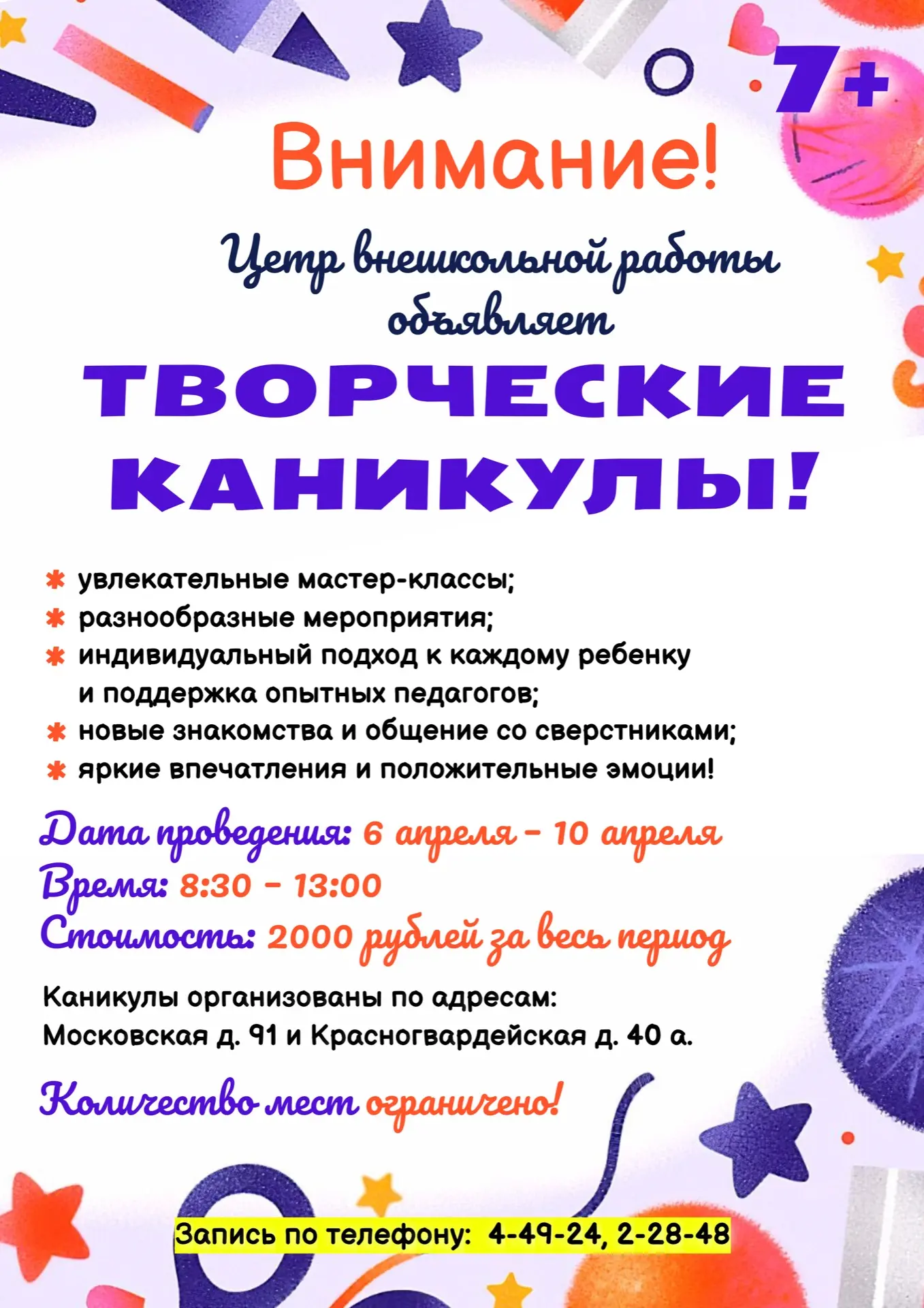 🤗 Рады сообщить вам о проведении творческих каникул в Центре внешкольной работы с 6 по 10 апреля.