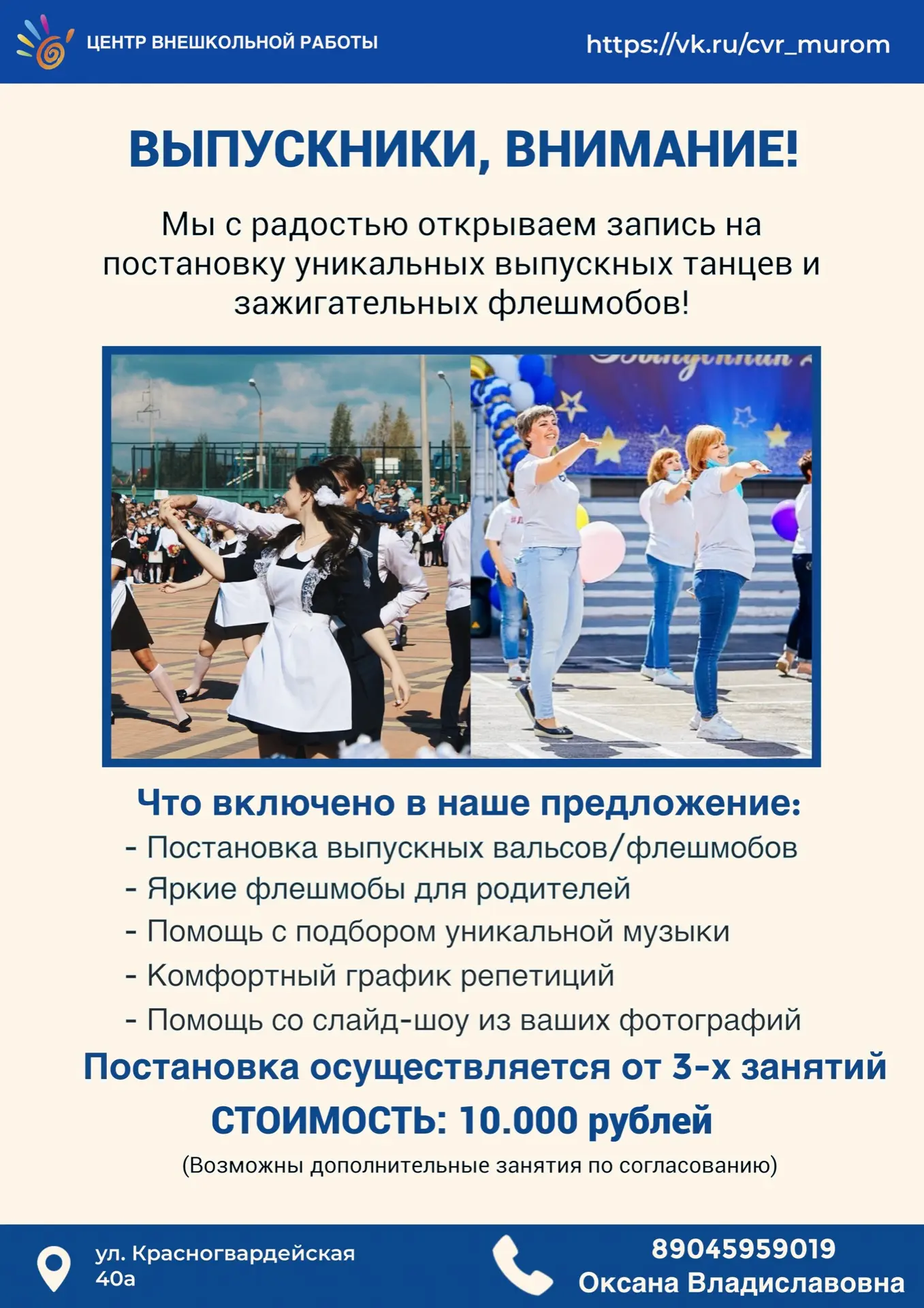 С радостью сообщаем, что Центр внешкольной работы открывает запись на постановки школьных вальсов, а также флешмобов для выпускников и родителей ! 💃✨