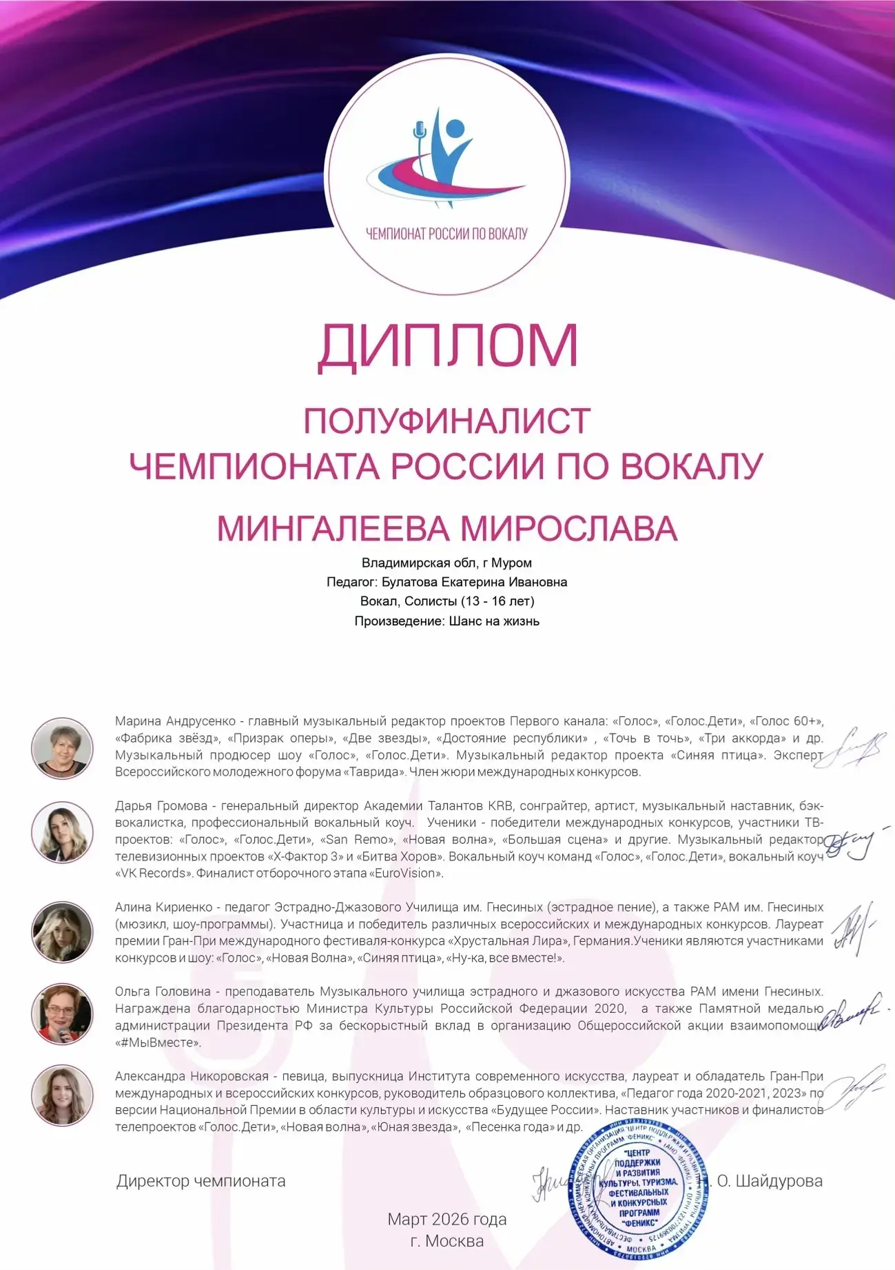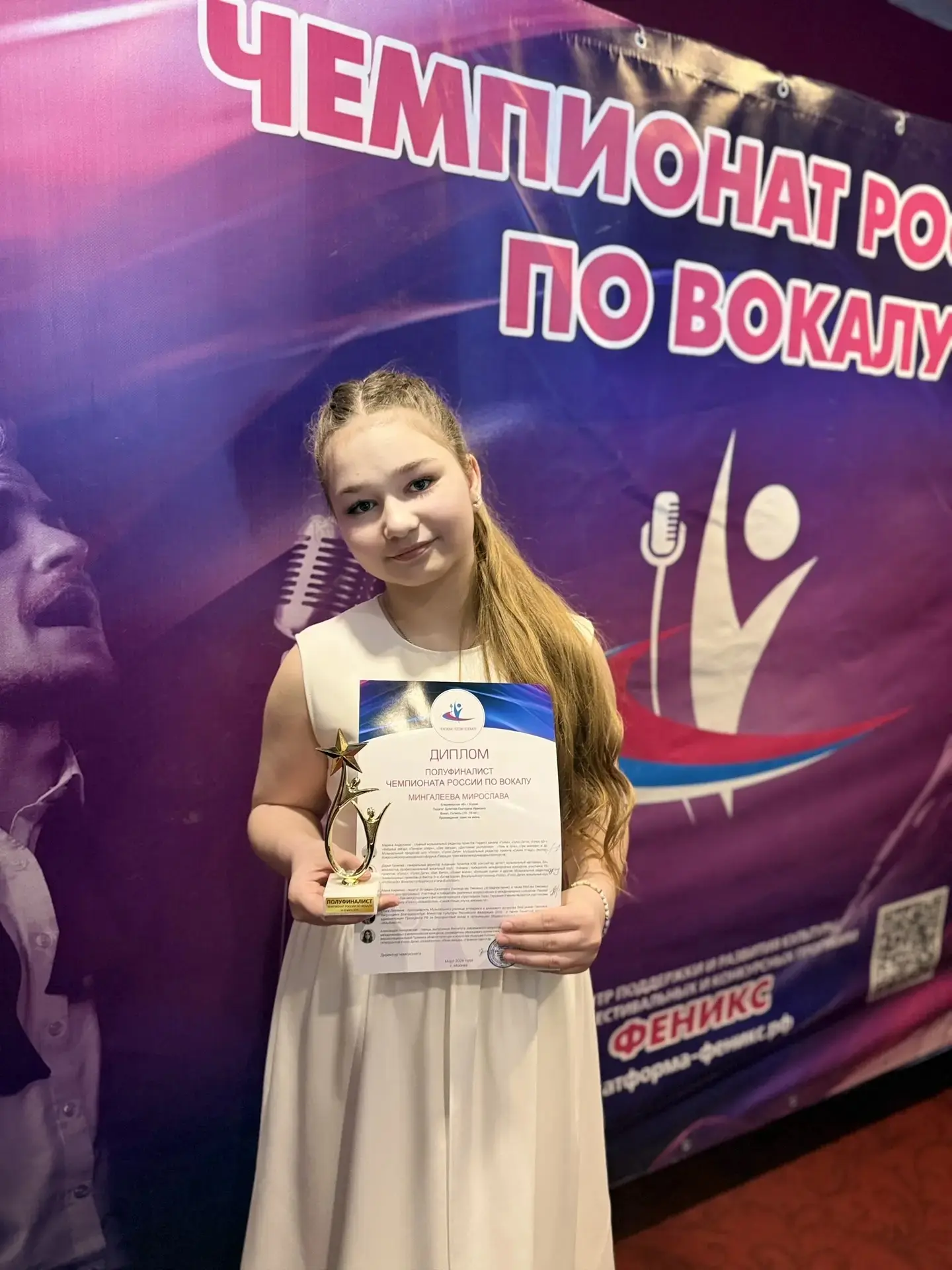 🥳 Мы спешим поздравить нашу талантливую ученицу, Мингалееву Мирославу, которая достигла невероятных высот, став полуфиналистом Чемпионата России по вокалу! 🎤 Это фантастическое достижение – результат упорного труда, безграничного таланта и несгибаемой воли к победе. 💪