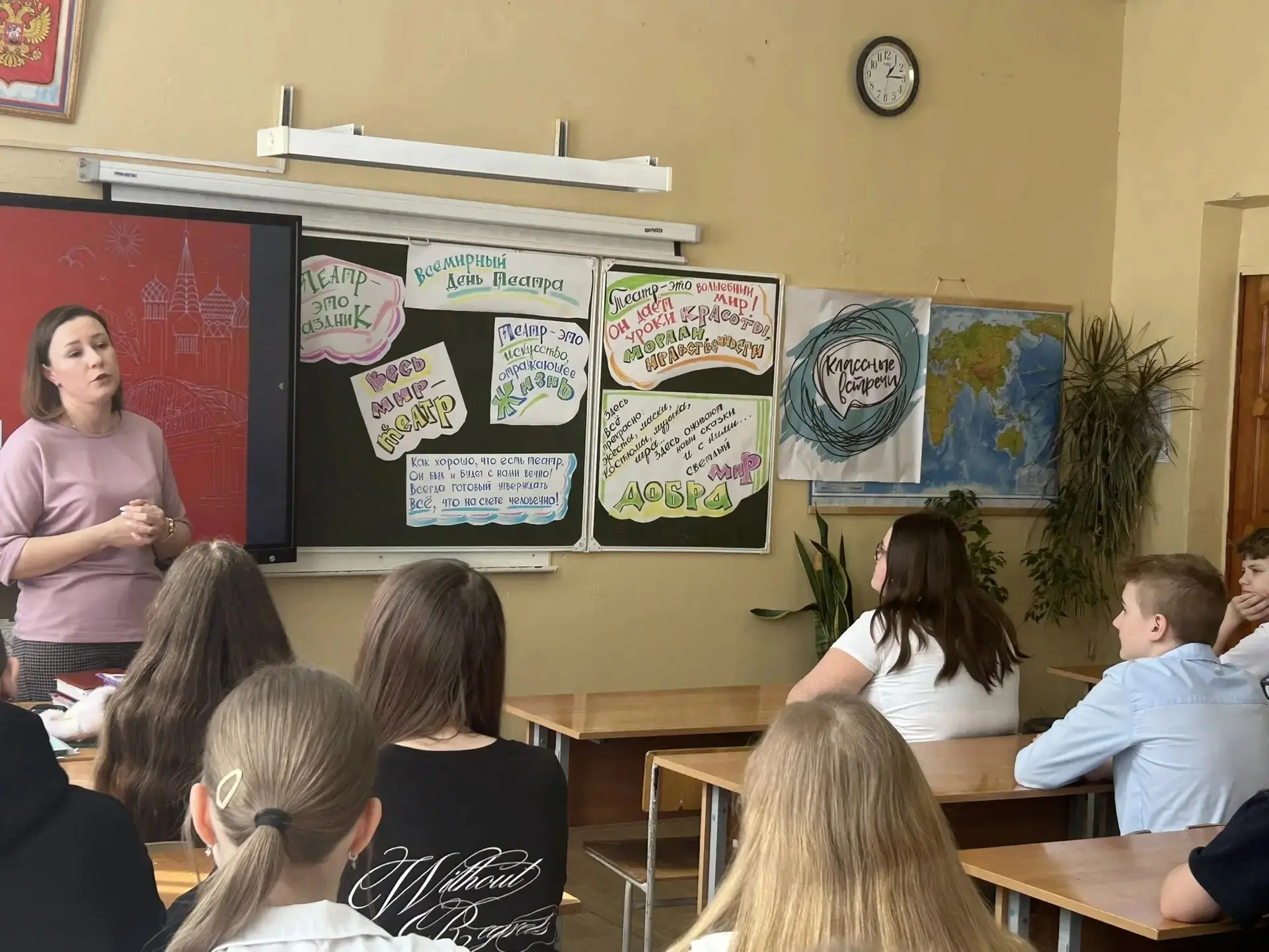 День театра с Настоящим театралом! Активисты первичного отделения нашей Пятнадцатой сегодня стали участниками Классной встречи с руководителем театральных студий "Волна" и "КаРаБаСБаРаБаС" Центра внешкольной работы, педагогом - театралом Екатериной Геннадьевной Юшиной. Так было интересно поговорить с человеком, чья детская мечта и вдохновение стало делом и профессией - быть на театральных подмостках не гостем, а участником. Екатерина Геннадьевна принесла с собой фотоальбом, в котром ребята узнали теперь уже взрослых выпускников школы, которые связали свою жизнь с театром. Даже класс, где мы общались был оформлен позитивными и смысловыми речевыми облачками: "Весь мир театр.....". Синтетическое искусство, не теряющее своей актуальности, сегодня способно помочь любому стать сильнее, увереннее и счастливее. Спасибо за встречу! Было Классно!