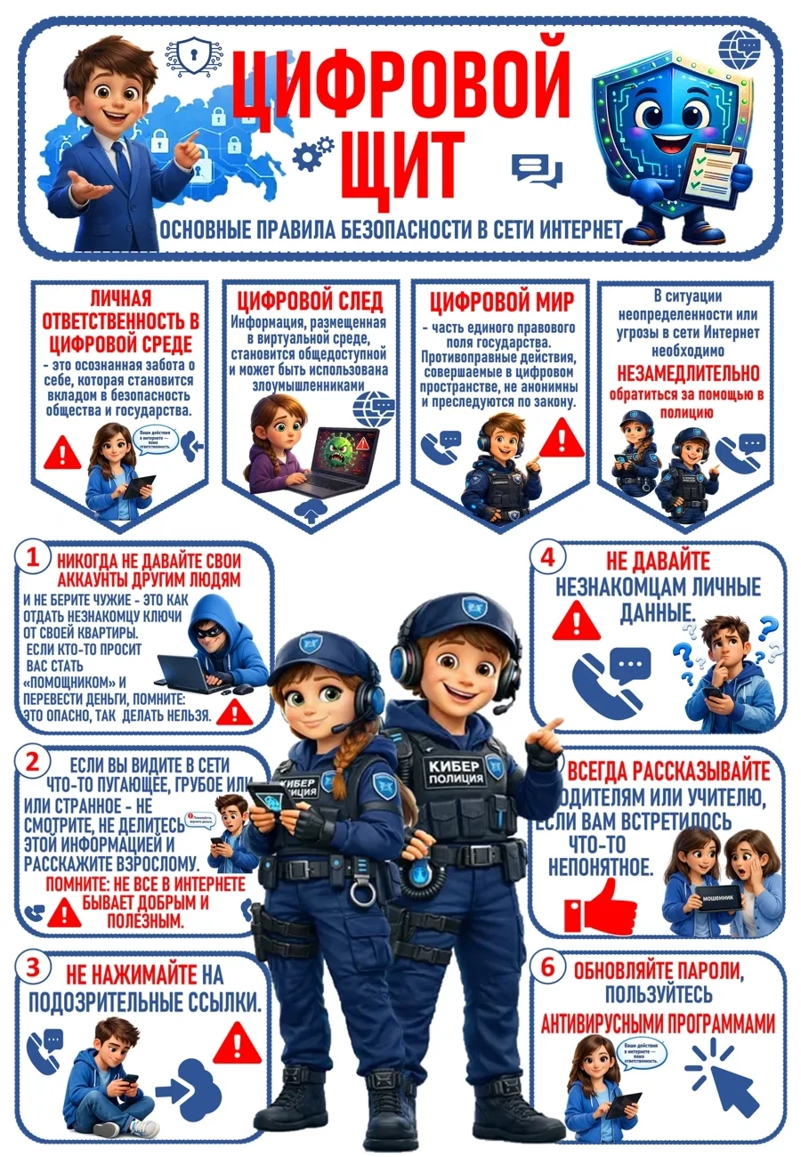 Сегодня на занятии «Разговоры о важном» мы говорили о том, как защитить себя в цифровом пространстве. Интернет — это огромный мир возможностей: обучение, общение, творчество. Но, как и в реальной жизни, здесь важно соблюдать правила безопасности.