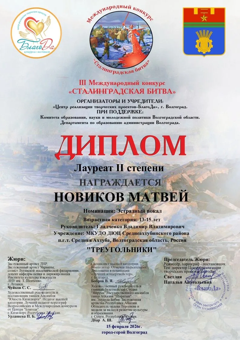 👏Ученик 8в класса, Новиков Матвей принял участие в III Международном конкурсе "Сталинградская битва" и стал лауреатом II степени🎉🏆! ПОЗДРАВЛЯЕМ! Желаем творческих успехов👏!