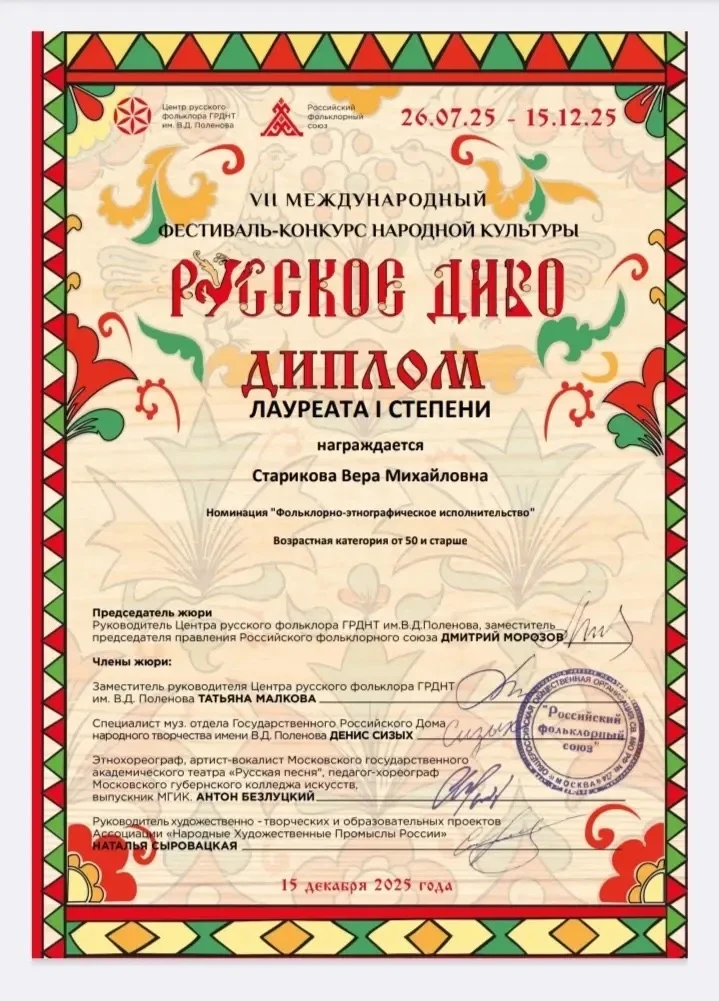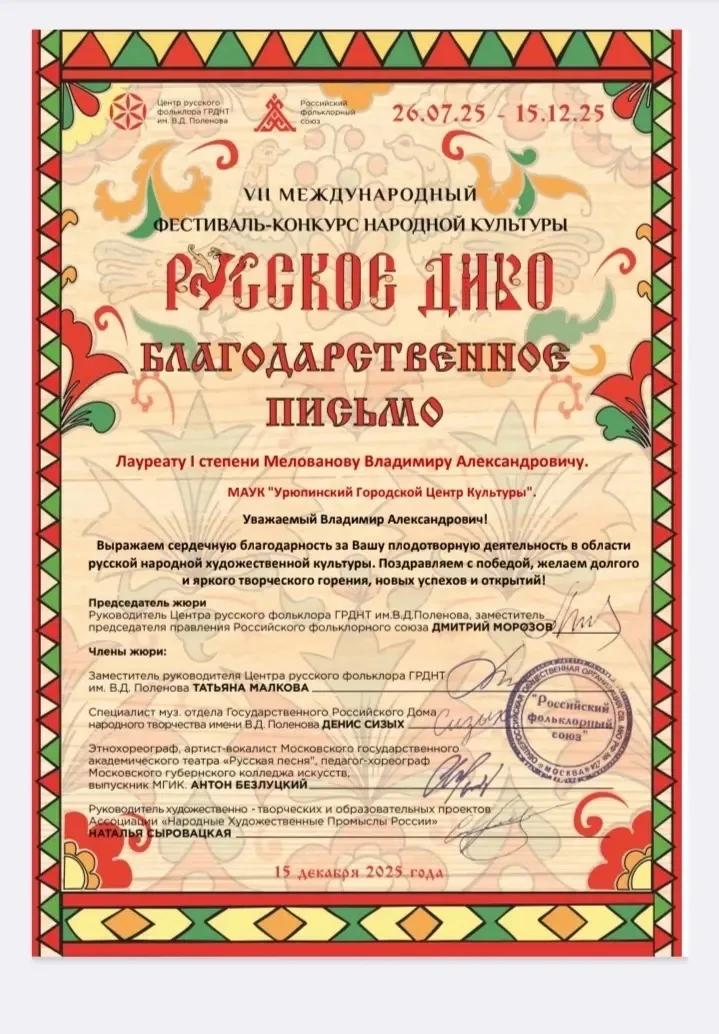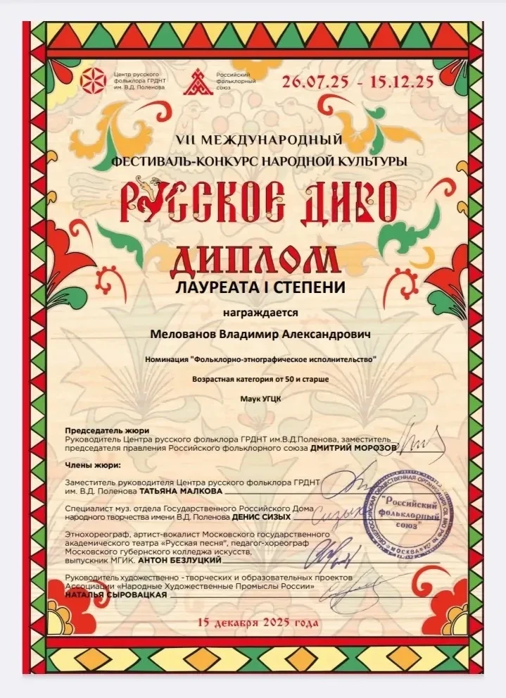 🎉Участники самодеятельных народных коллективов Урюпинского городского центра культуры В. М. Старикова и В. А. Мелованов стали победителями и обладателями дипломов I -й степени VII Международного фестиваля- конкурса народной культуры, организованного я государственным домом народного творчества им.