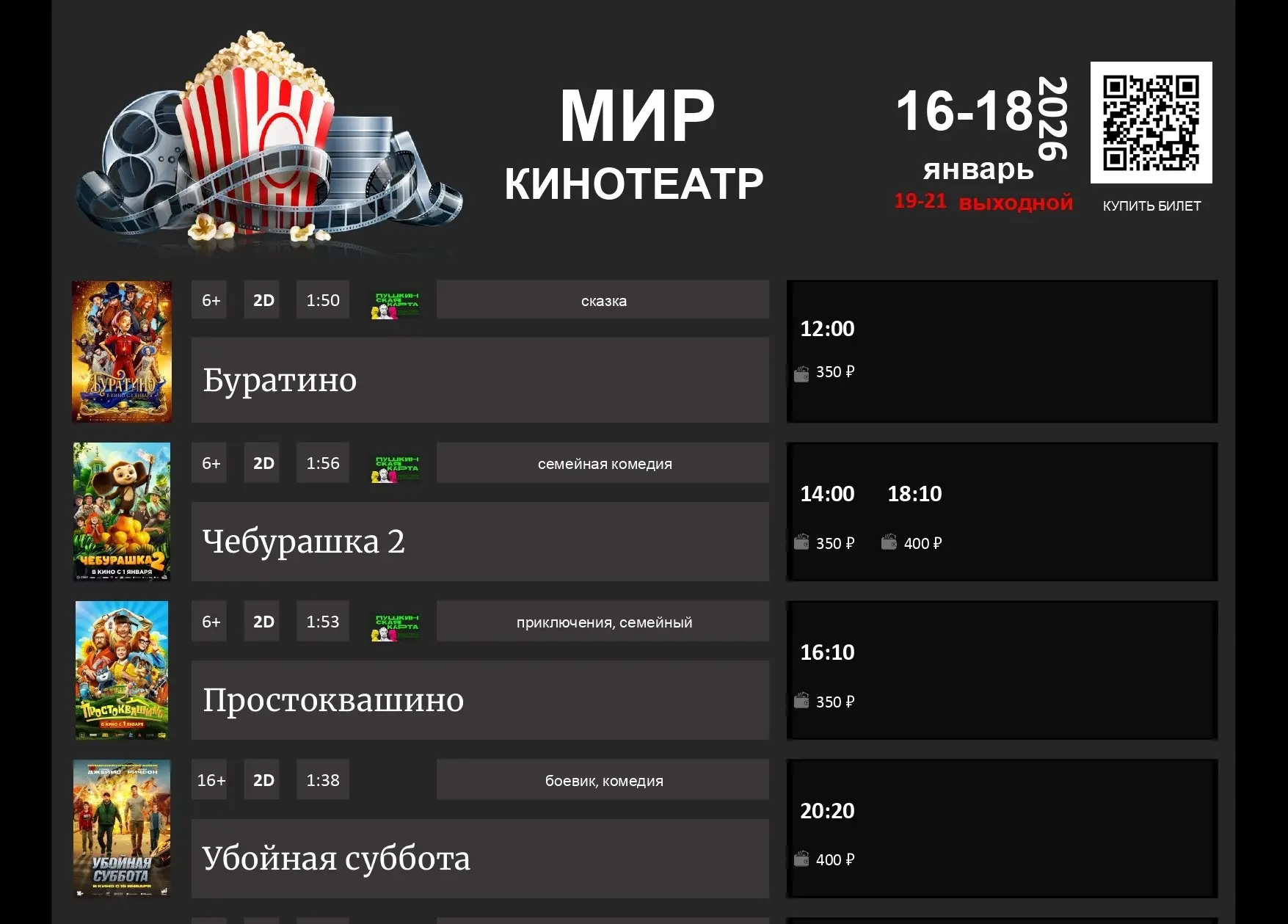 🎄🎉 РАСПИСАНИЕ К/Т "МИР" с 16 - 18 ЯНВАРЯ!