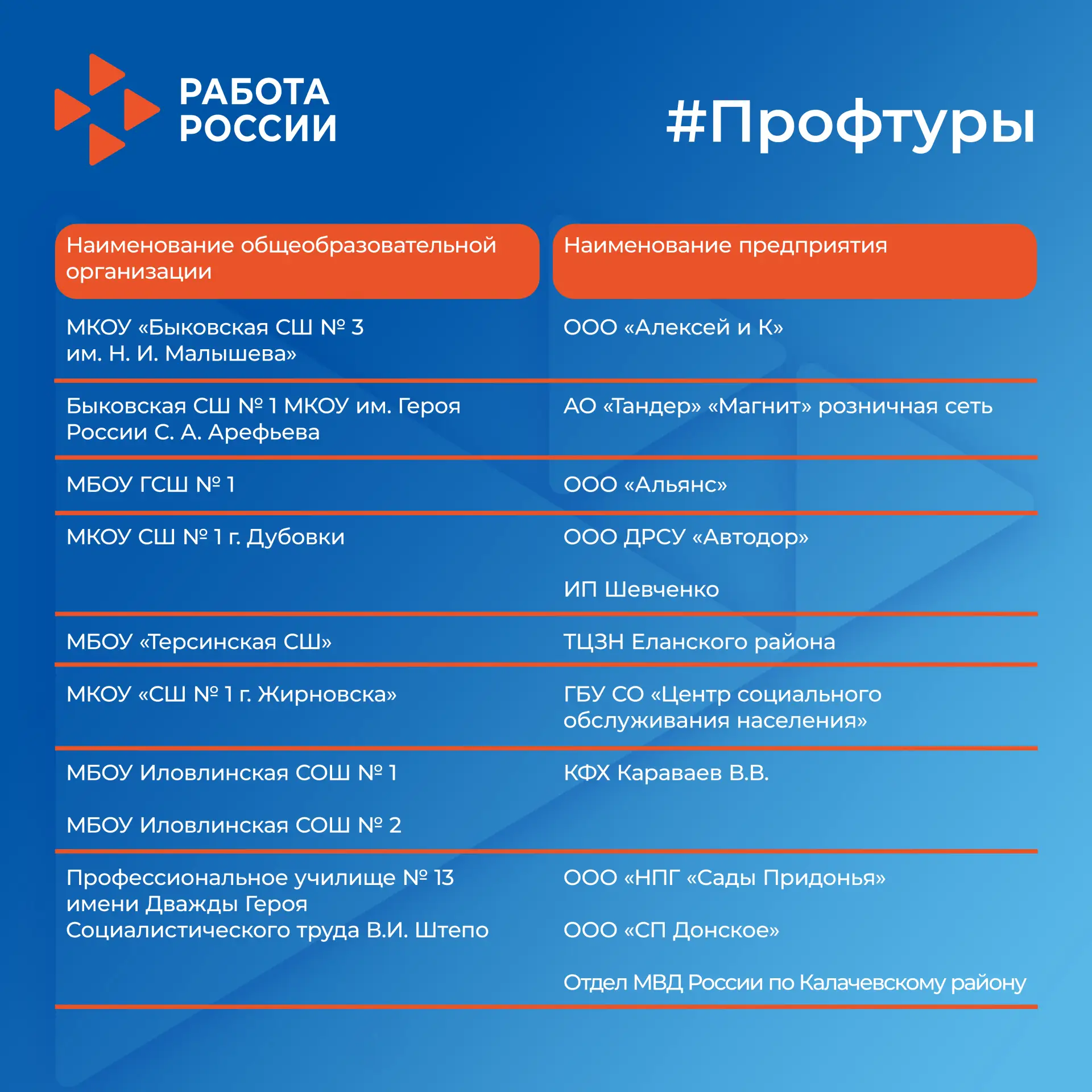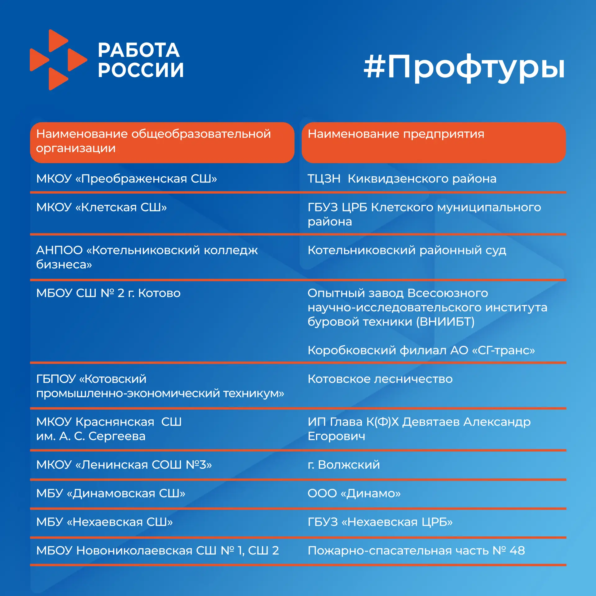 Если вы школьник, родитель или педагог и хотите организовать профтур для своего класса — свяжитесь с кадровым центром по месту жительства. Специалисты подскажут, есть ли такая возможность и помогут с организацией.