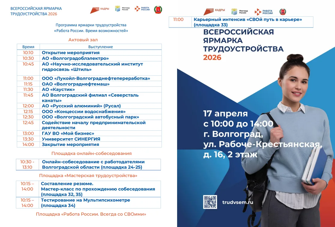 Уже 17 апреля в Волгоградской области стартует региональный этап Всероссийской ярмарки трудоустройства. Это день, когда работодатели и соискатели встречаются напрямую — без лишних шагов.