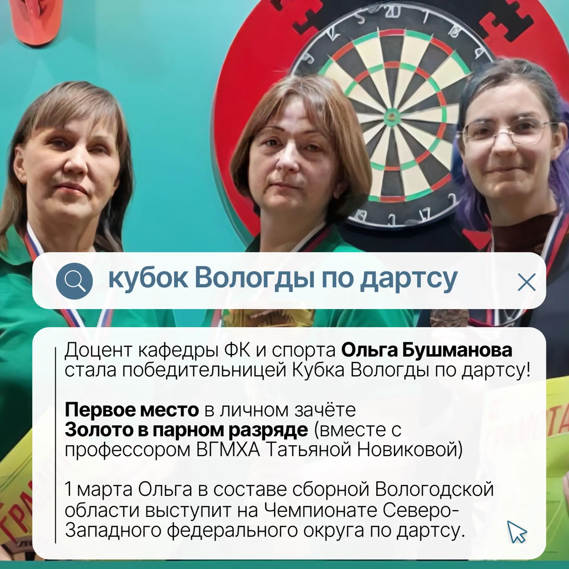 Двойной успех нашего преподавателя — Ольга Ивановна не только завоевала абсолютную победу в личном зачёте Кубка Вологды, но и взяла золото в парном разряде вместе с профессором ВГМХА Татьяной Новиковой.