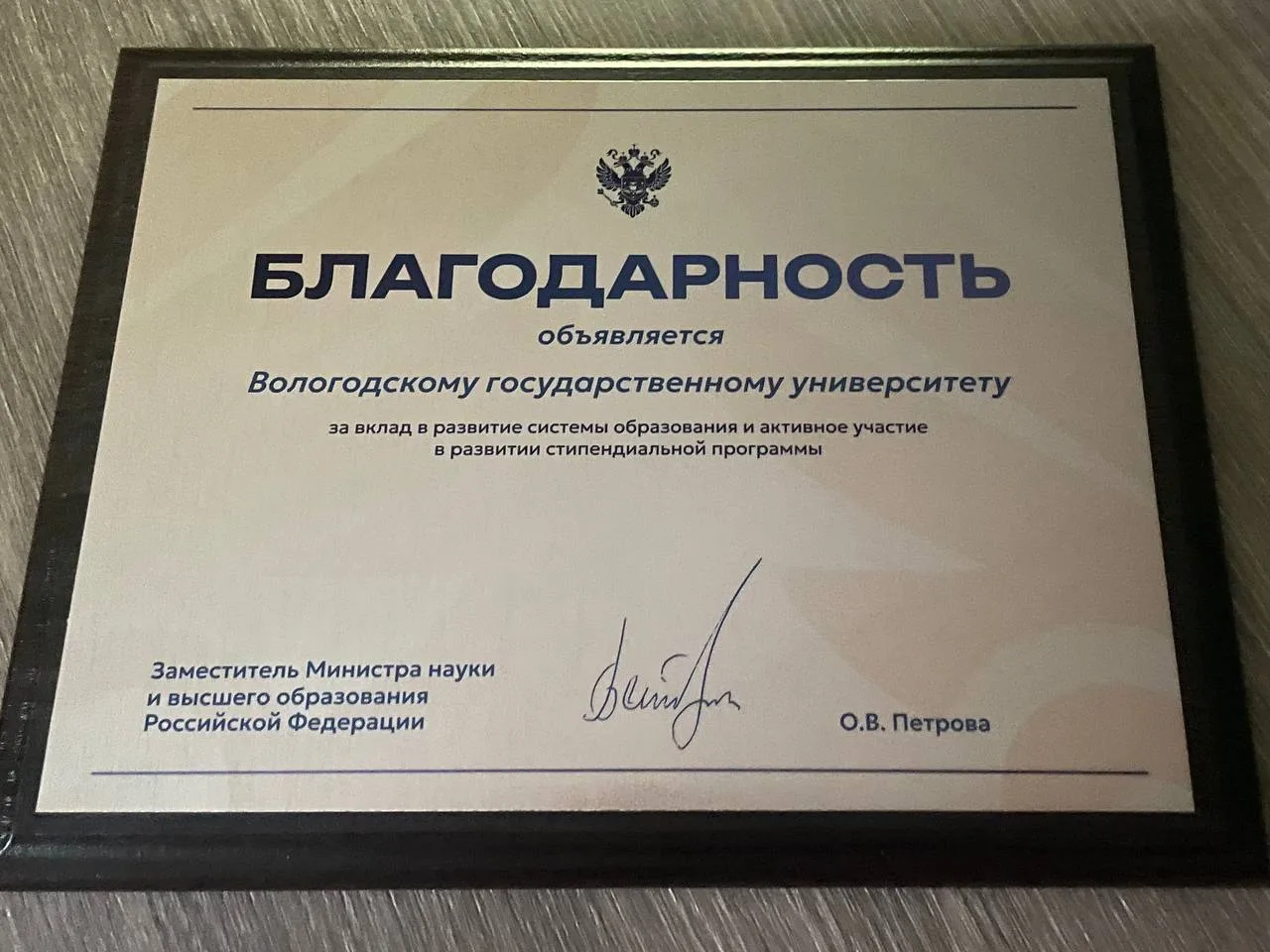 Нашему университету на церемонии также была вручена благодарность Заместителя Министра науки и высшего образования Российской Федерации Ольги Петровой за вклад в развитие системы образования и активное участие в реализации стипендиальной программы.
