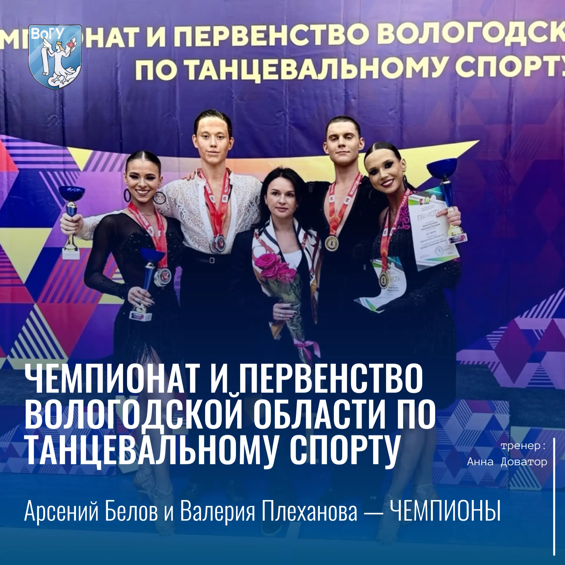 На Чемпионате и Первенстве Вологодской области по танцевальному спорту золото завоевали выпускник Института педагогики и психологии ВоГУ Арсений Белов и студентка Университетского колледжа ВоГУ Валерия Плеханова.