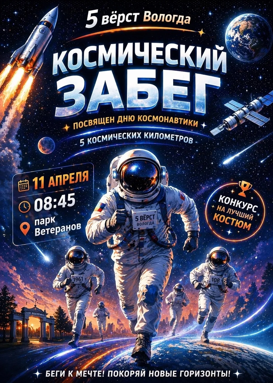 🚀 Также участникам предлагают принять участие в конкурсе на самый оригинальный костюм. Для этого необходимо прийти на забег в костюме космонавта, инопланетянина, ракеты или другого космического персонажа или объекта. Организаторы выберут самые креативные образы и наградят победителей призами.