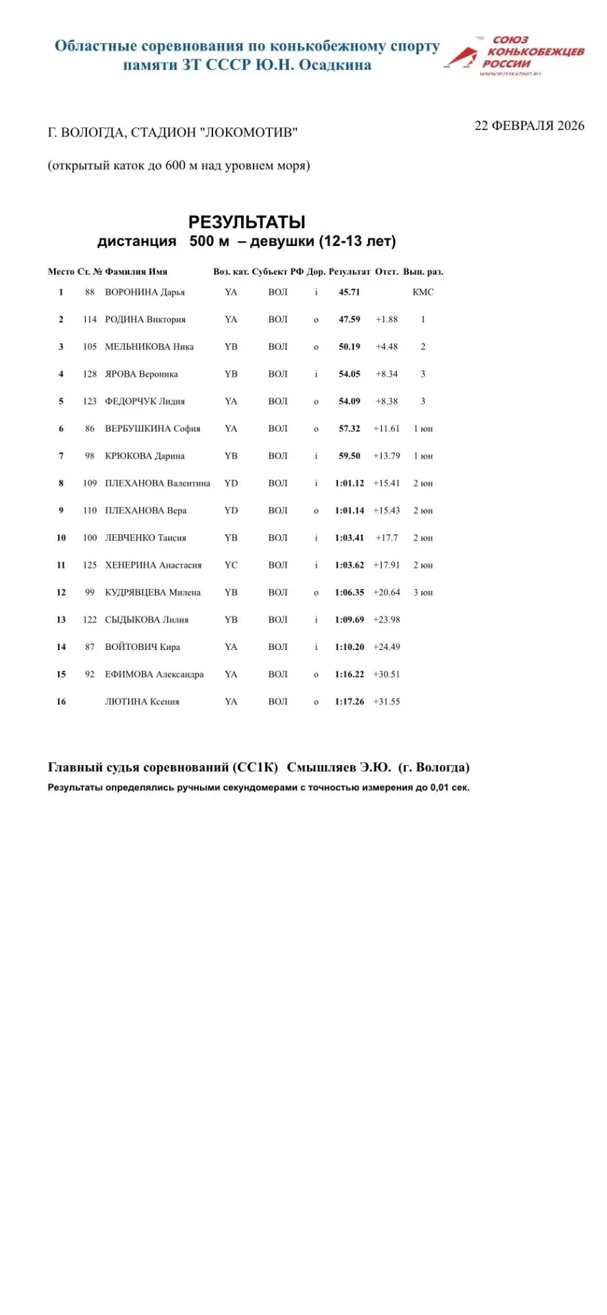 Поздравляем Воронину Дарью с успешным выступлением на Областных соревнованиях по конькобежному спорту памяти заслуженного тренера СССР Ю.Н. Осадкина, где спортсменка выполнила норматив кандидата в мастера спорта, показав результат на дистанции 500 метров — 45,71 секунды!
