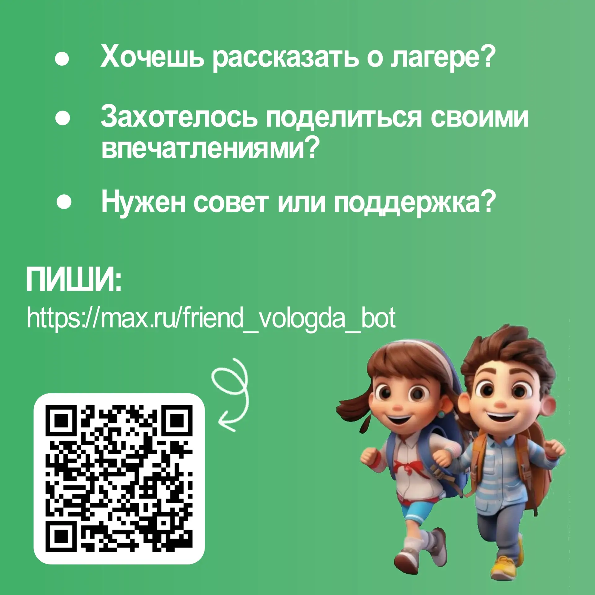 С его помощью можно обратиться за поддержкой, если что-то беспокоит, или поделиться эмоциями, интересными моментами своего отдыха в лагере. Чат-бот доступен по ссылке max.ru/friend_vologda_bot.