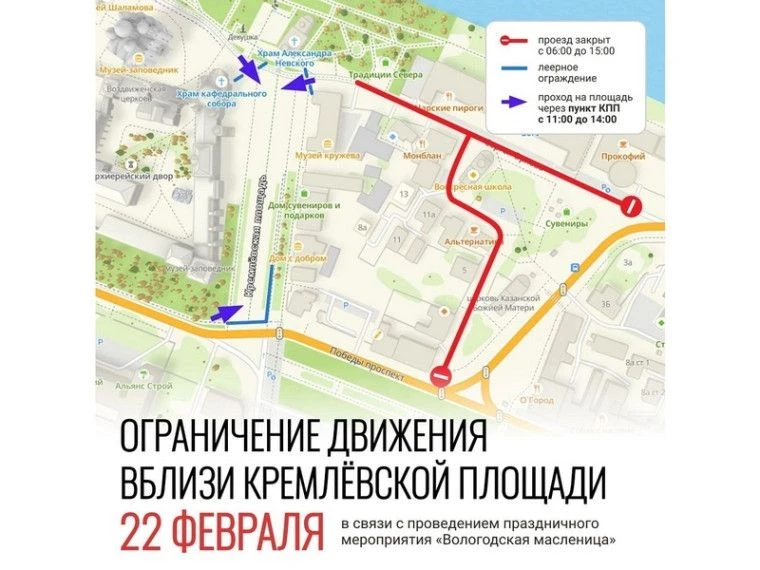 В Вологде основной площадкой Масленицы станет Кремлевская площадь. 22 февраля здесь пройдет большой городской праздник с интерактивными площадками, традиционными забавами и большим шествием ряженых, которые закружат вологжан в «хороводе согласия». Выступят вологодские коллективы и московская фолк-группа «Талица». Самым вкусным событием праздника станет гастрономическое шоу «Блинный разгуляй».