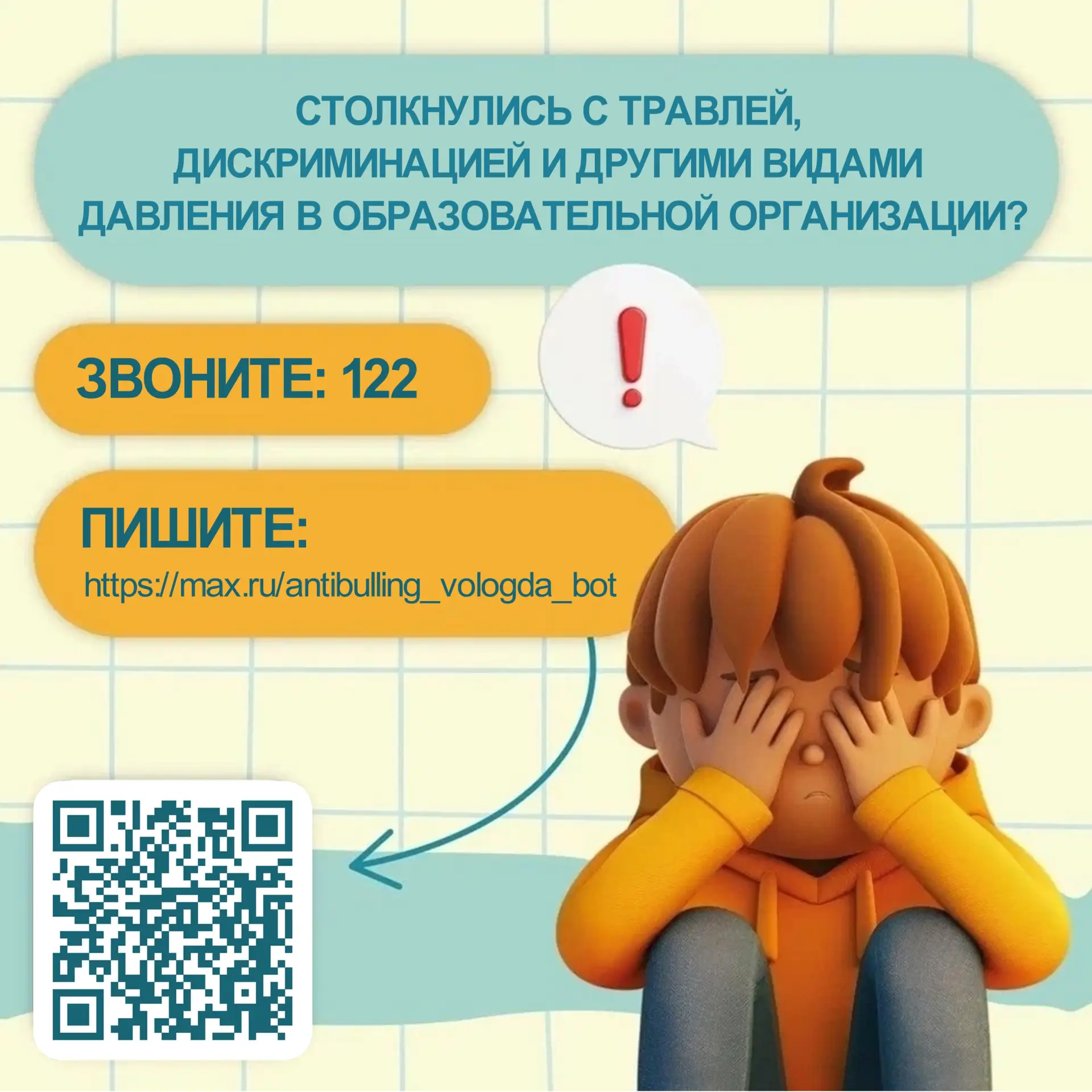 По ссылке max.ru/antibulling_vologda_bot можно анонимно рассказать о любых видах давления в образовательных организациях, получить практические советы и рекомендации, запросить ответный звонок опытного педагога-психолога.