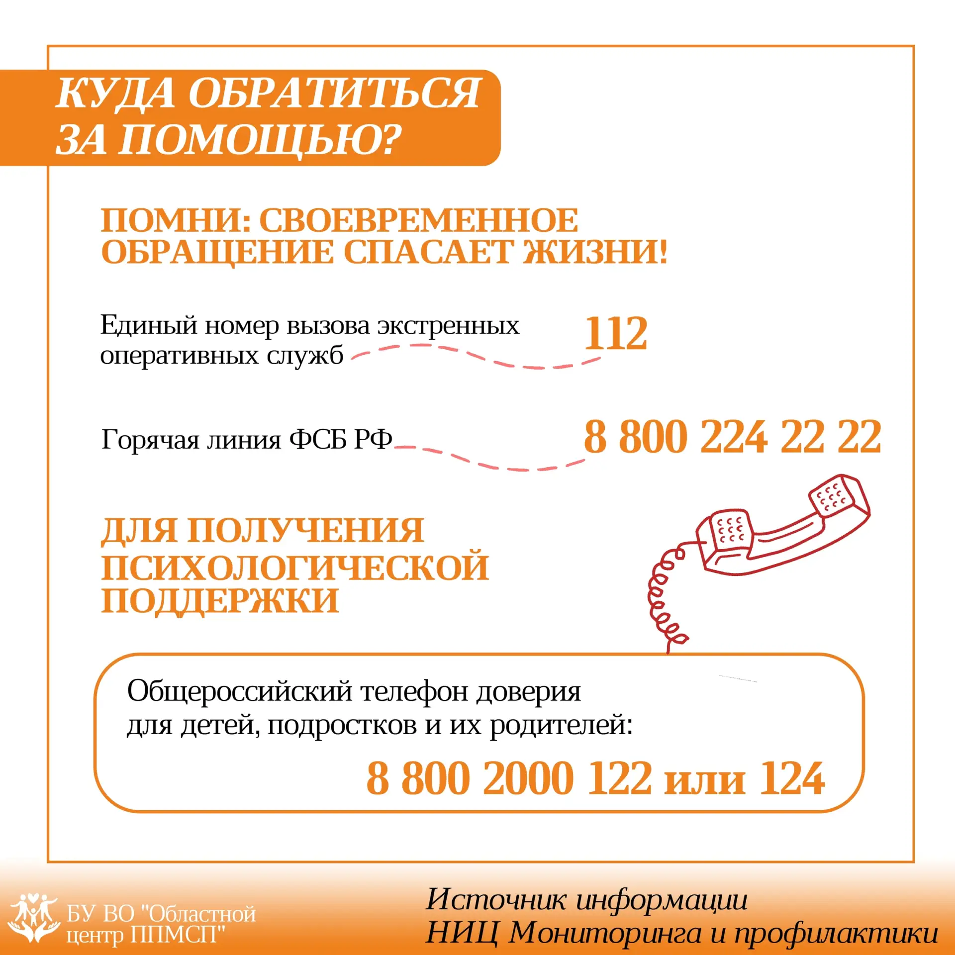 ☎ Экстренная психологическая помощь доступна для детей, подростков и их родителей на всей территории Российской Федерации по единому общероссийскому номеру 📞 8-800-2000-122, короткий номер с мобильных телефонов - 124. Помощь оказывается круглосуточно, бесплатно, анонимно. Позвонить можно со стационарного или мобильного телефона.