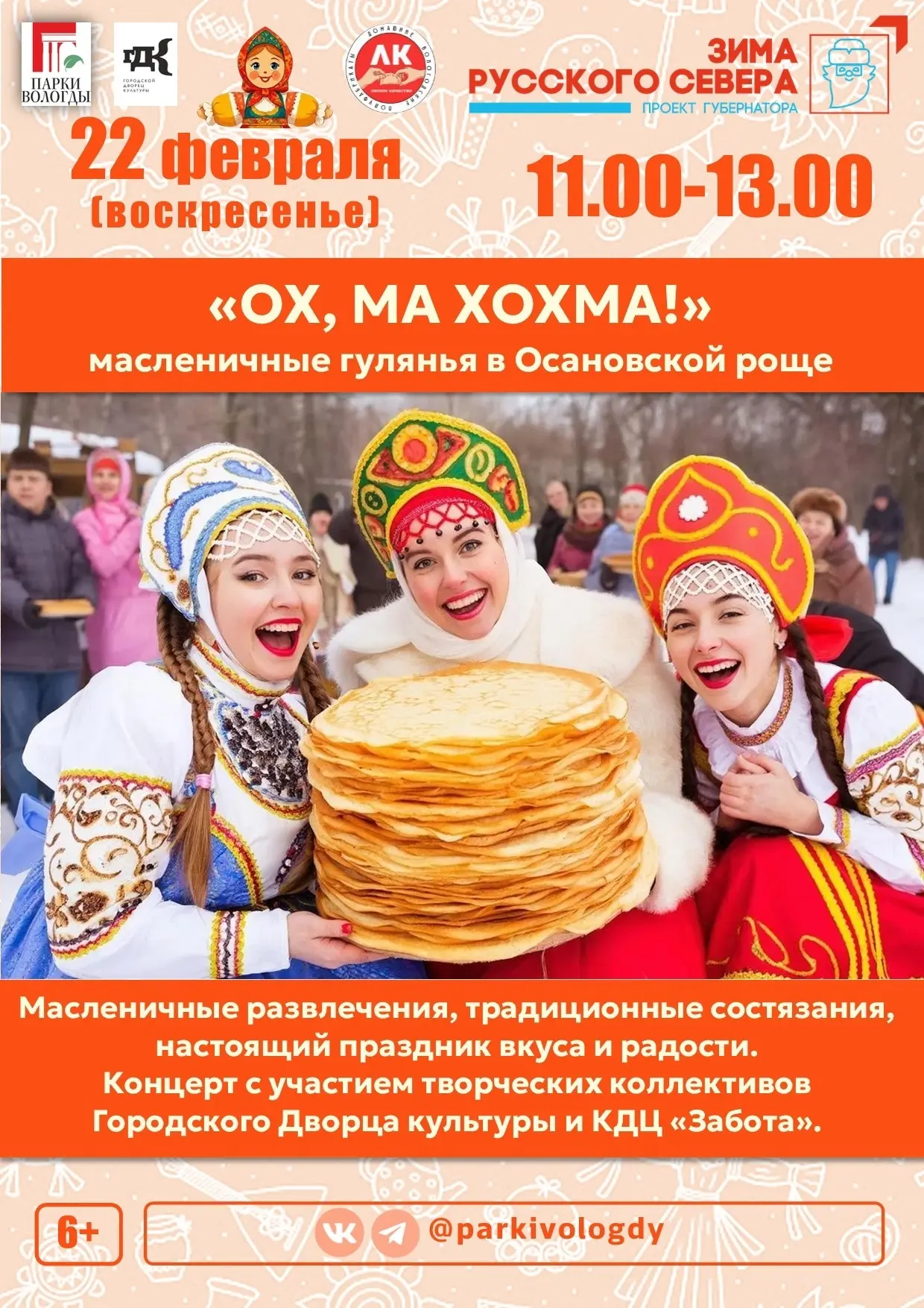 12:30 – 13:00 – гастрономическое шоу «Блинный разгуляй»: шеф-повара вологодских ресторанов приготовят для вологжан 1500 «кружевных блинов», а также 1000 порций облепихового чая. 0+
