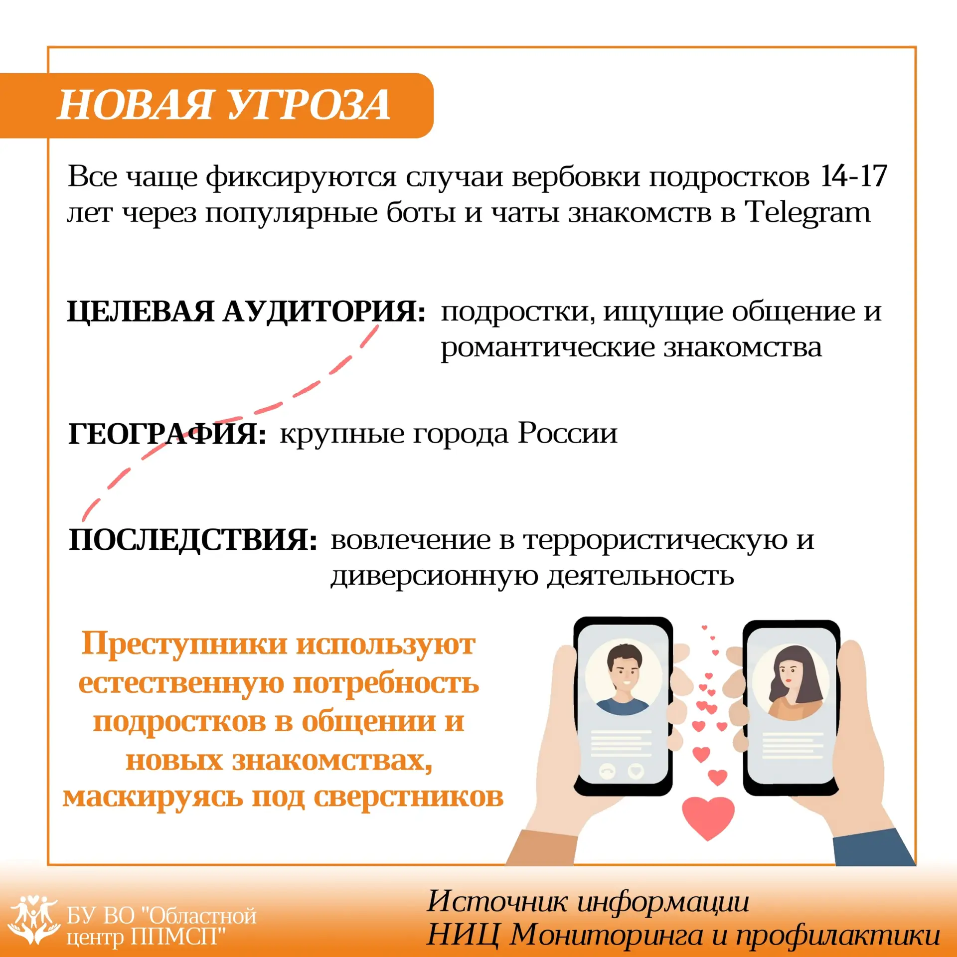 📲 Сегодня злоумышленники все чаще используют анонимные чаты знакомств, чтобы выманить у подростков личные данные, втянуть их в опасные задания или склонить к противоправным действиям. Манипуляции строятся на дружелюбии, комплиментах, ощущении «особого внимания», а затем переходят к просьбам, давлению или шантажу.
